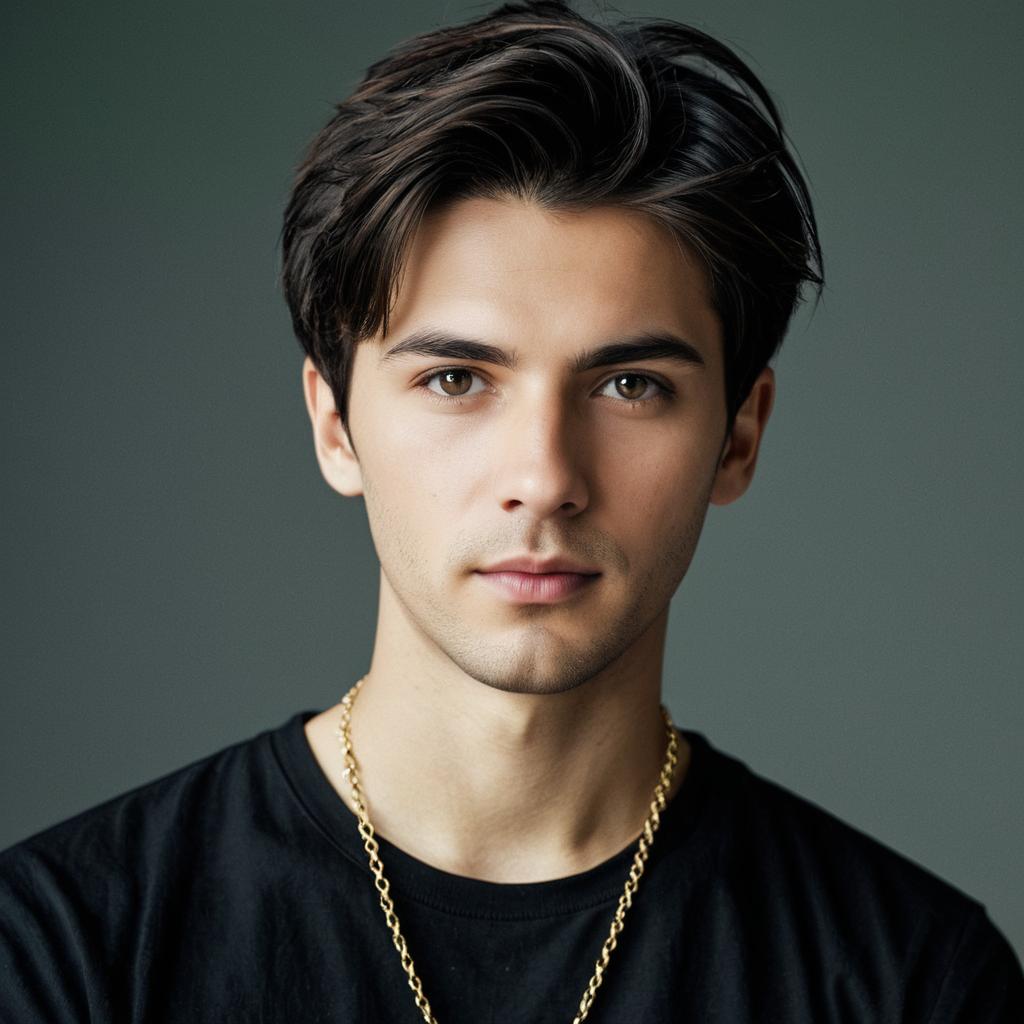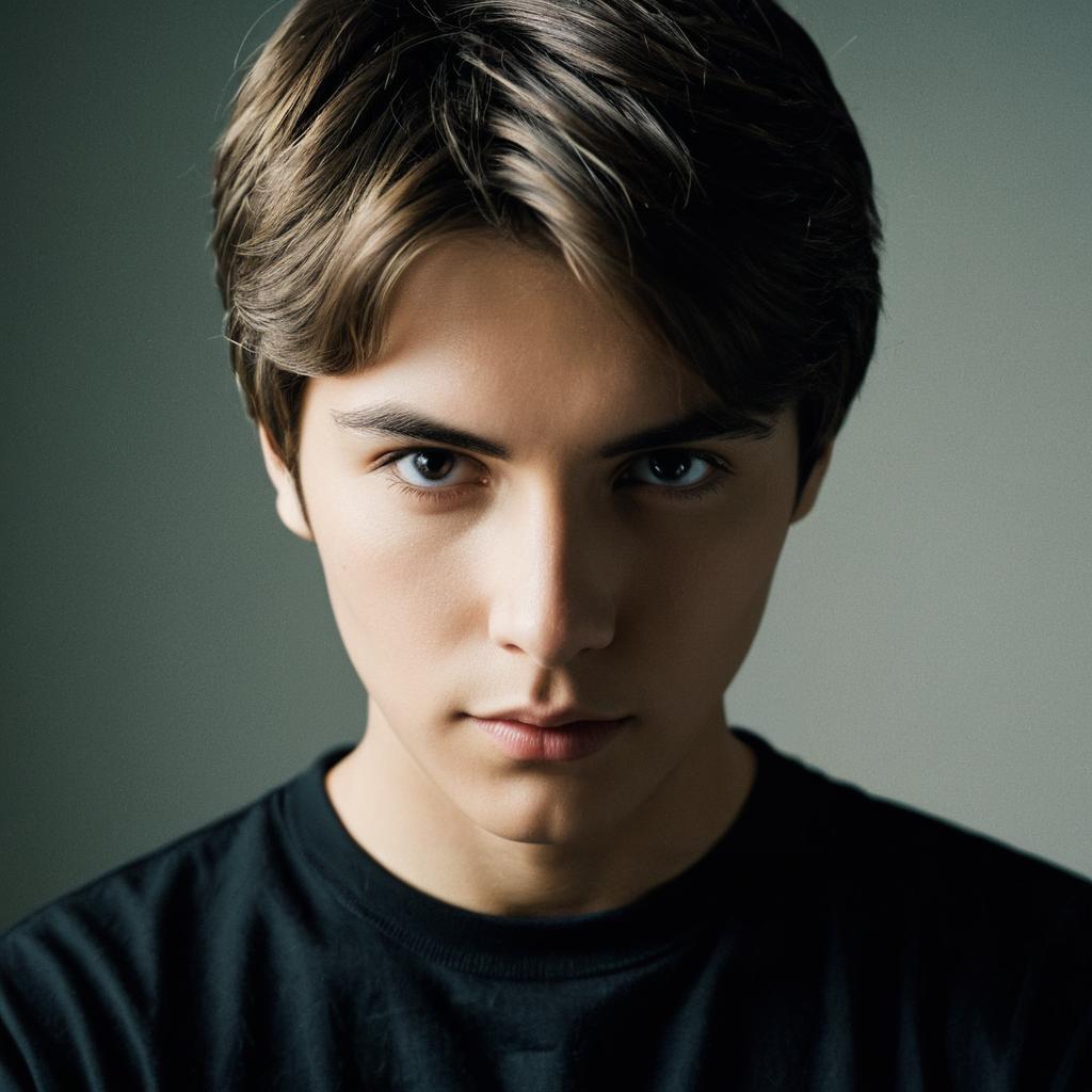 Close-up portrait of a young Caucasian man with brown hair and brown eyes wearing a blue collared shirt with buttons and a breast pocket. The background is blurred to emphasize the subject's serious expression and detailed facial features.