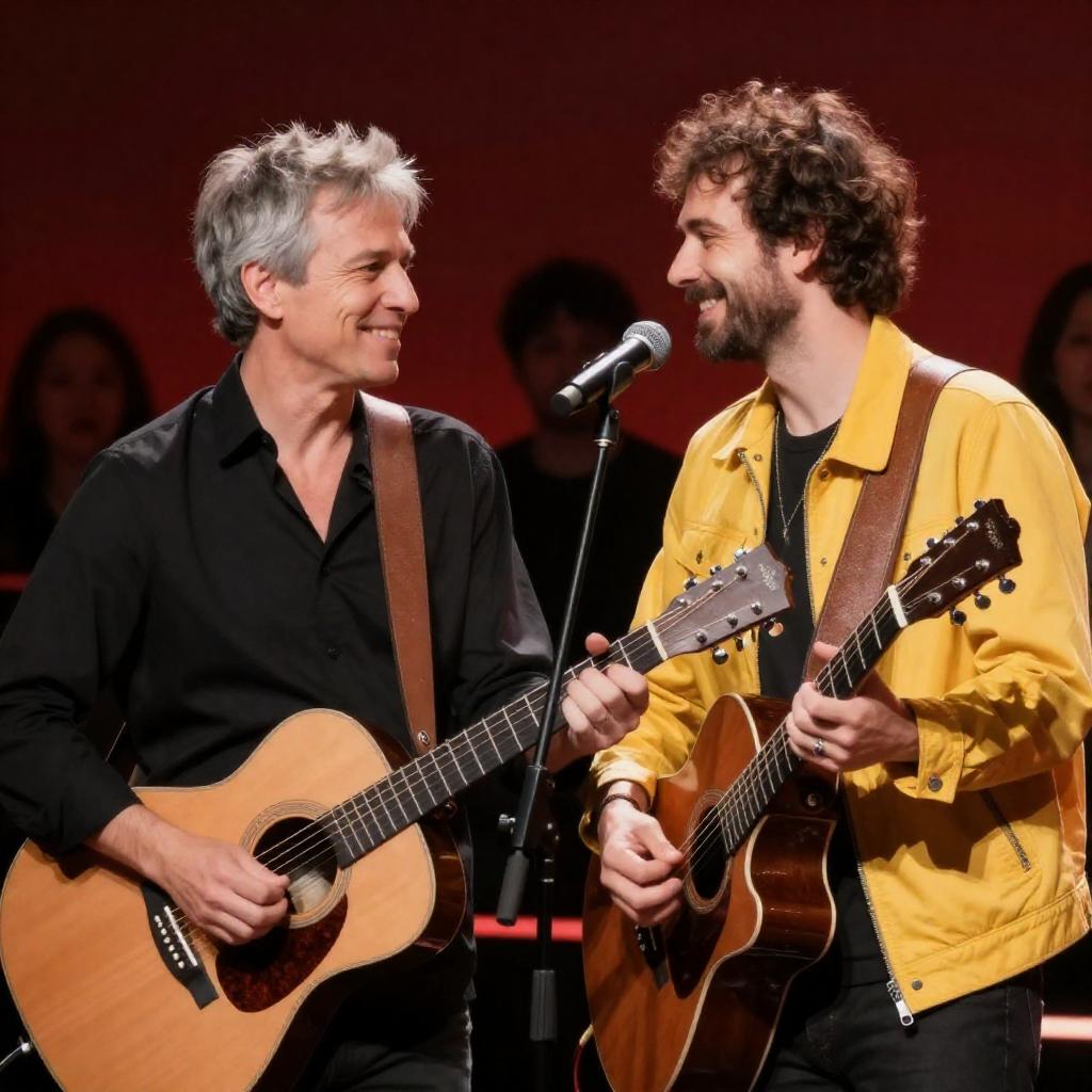 Photograph of two male musicians on stage. The man on the left, with short gray hair, wears a black shirt and plays a brown acoustic guitar. The man on the right, with curly brown hair and a beard, wears a bright yellow jacket and plays an acoustic guitar. Both smile at each other, standing close with microphones in front. The background is a deep red, with silhouetted audience members.