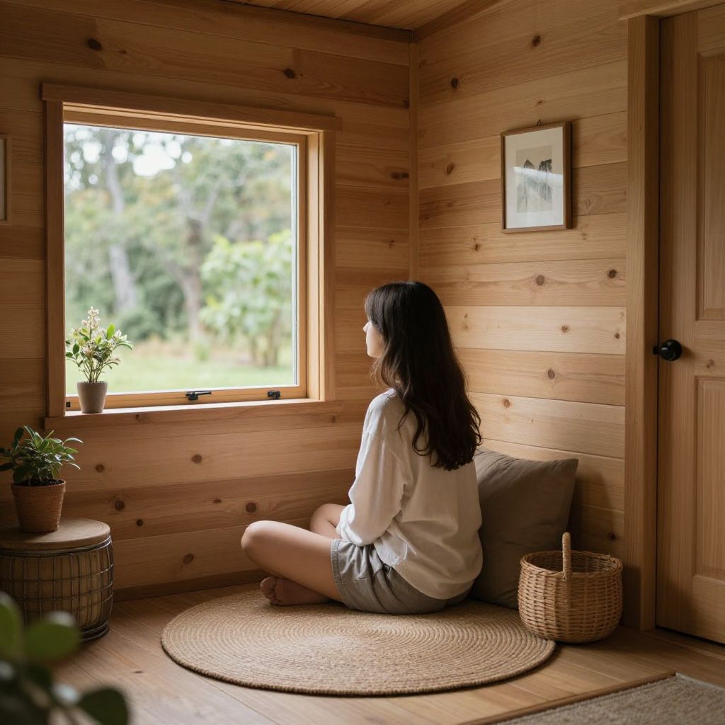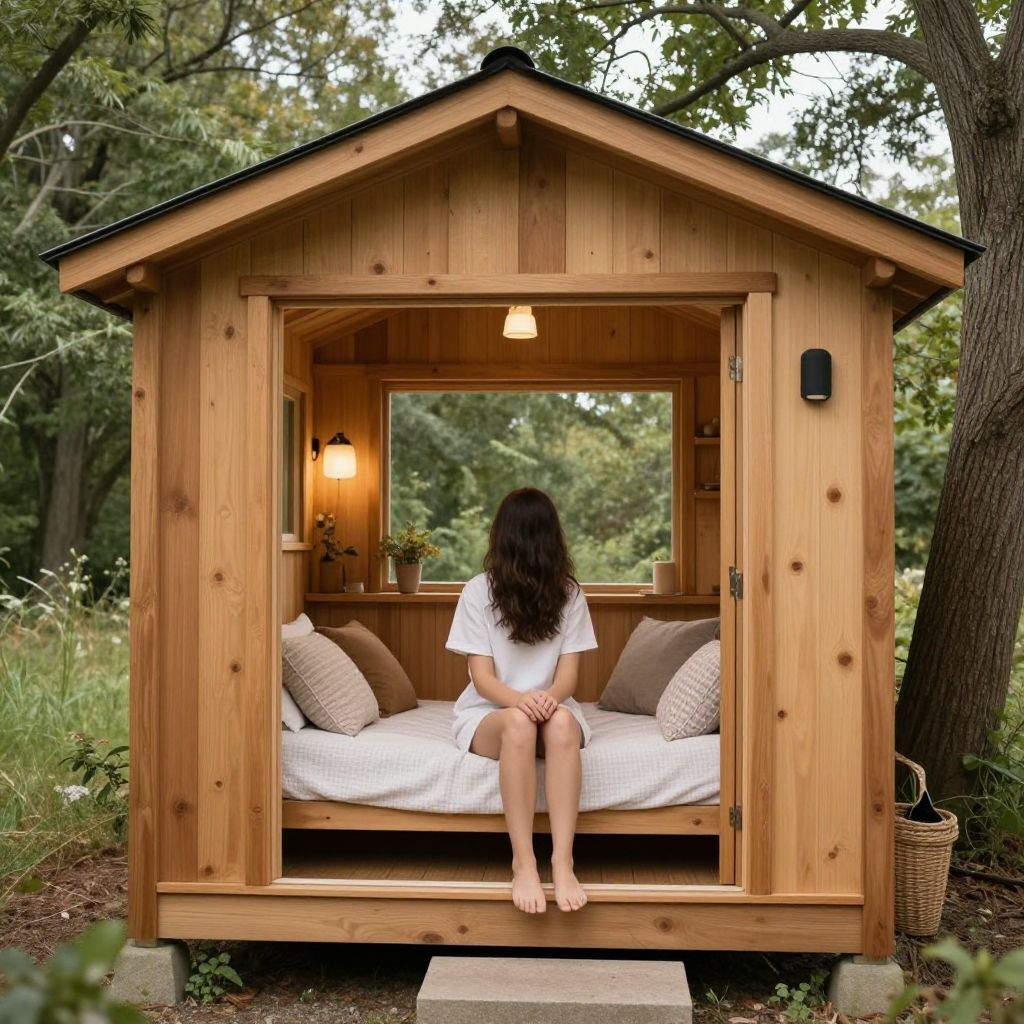 Embracing simplicity and serenity, a woman finds solace in her cozy tiny home, where the gentle hum of nature and the warmth of wooden textures weave a tapestry of freedom and introspection.