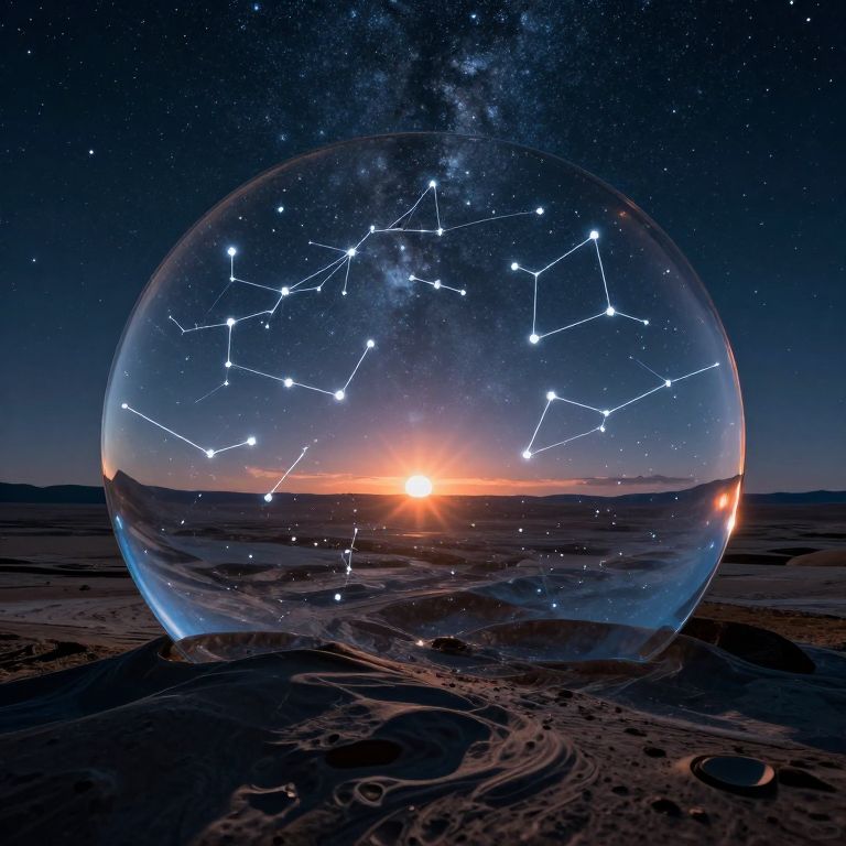 Photorealistic CGI of a transparent sphere on a sandy desert, displaying a constellation map against a starry night sky and sunset.