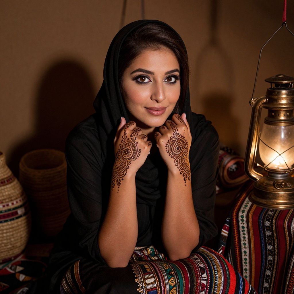 A captivating portrait photograph reveals a Middle Eastern woman with mesmerizing brown eyes and smooth olive skin adorned by intricate henna patterns winding around her fingers. Seated in an ancient desert tent's shadowy interior, she is illuminated by the soft glow of an oil lamp casting dancing shadows across her face. Viewed from just below eye level, we peer up at her leaning forward with a knowing smile that exudes warmth and intrigue. Rich textiles and woven baskets adorn the background, blending ancient traditions seamlessly with modern sensibilities in this innovative portrait. It perfectly balances reverence for cultural heritage and contemporary aesthetics.