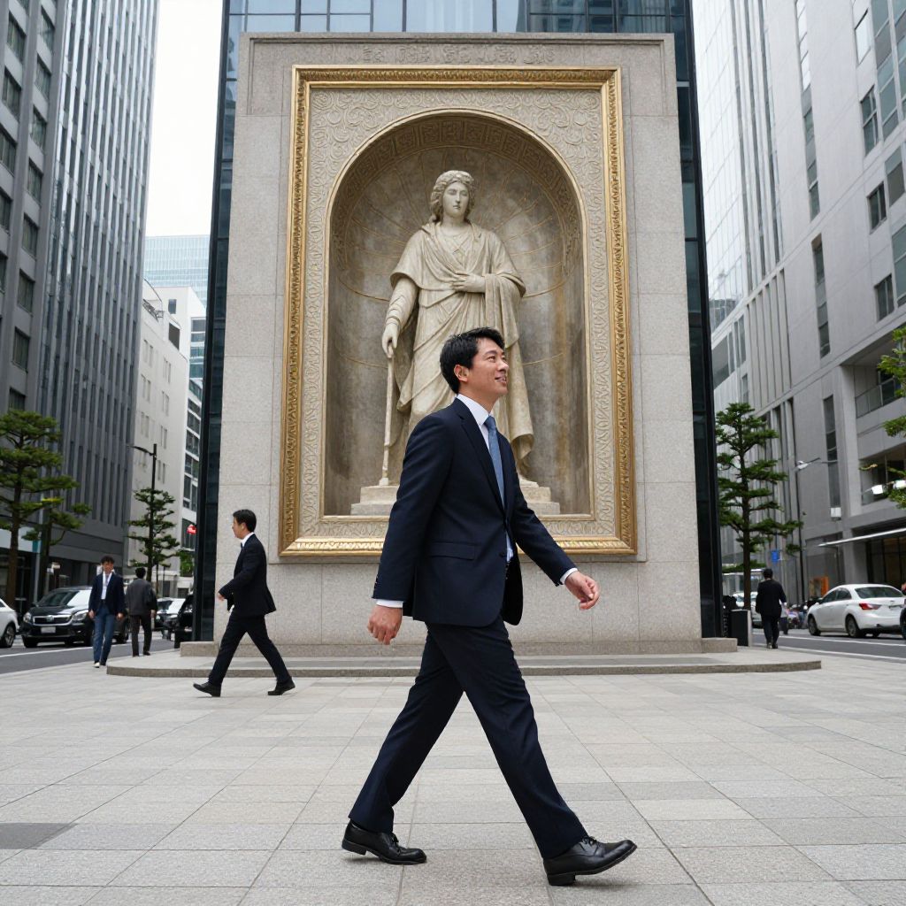 "Early Renaissance Art A Japanese businessman cheerfully walks through the beautiful business district to his office,"