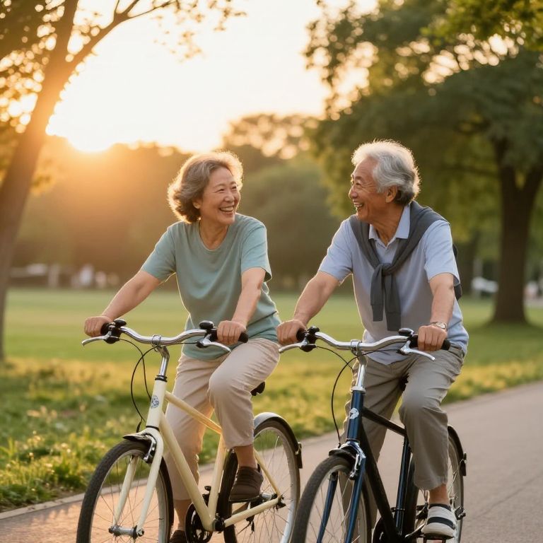 Under the golden embrace of the setting sun, a senior couple pedaling side by side embodies the enduring spirit of companionship and the rejuvenating power of shared moments, their laughter echoing through the serene park as the crisp air carries whispers of freedom and timeless love.