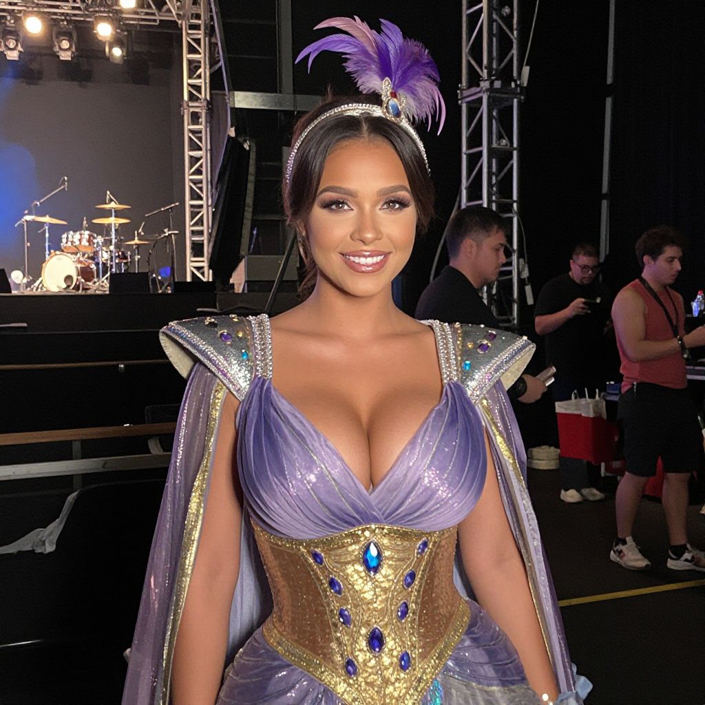 A stylish woman with a strong jawline, fair skin, and a confident smile, donning a queen band costume with a flowing purple and gold gown, a feathered headdress, and metallic shoulder pads, backstage at a music concert with lighting rigs, a drum set, and crew members in the background.. The woman has big breasts and cute face
