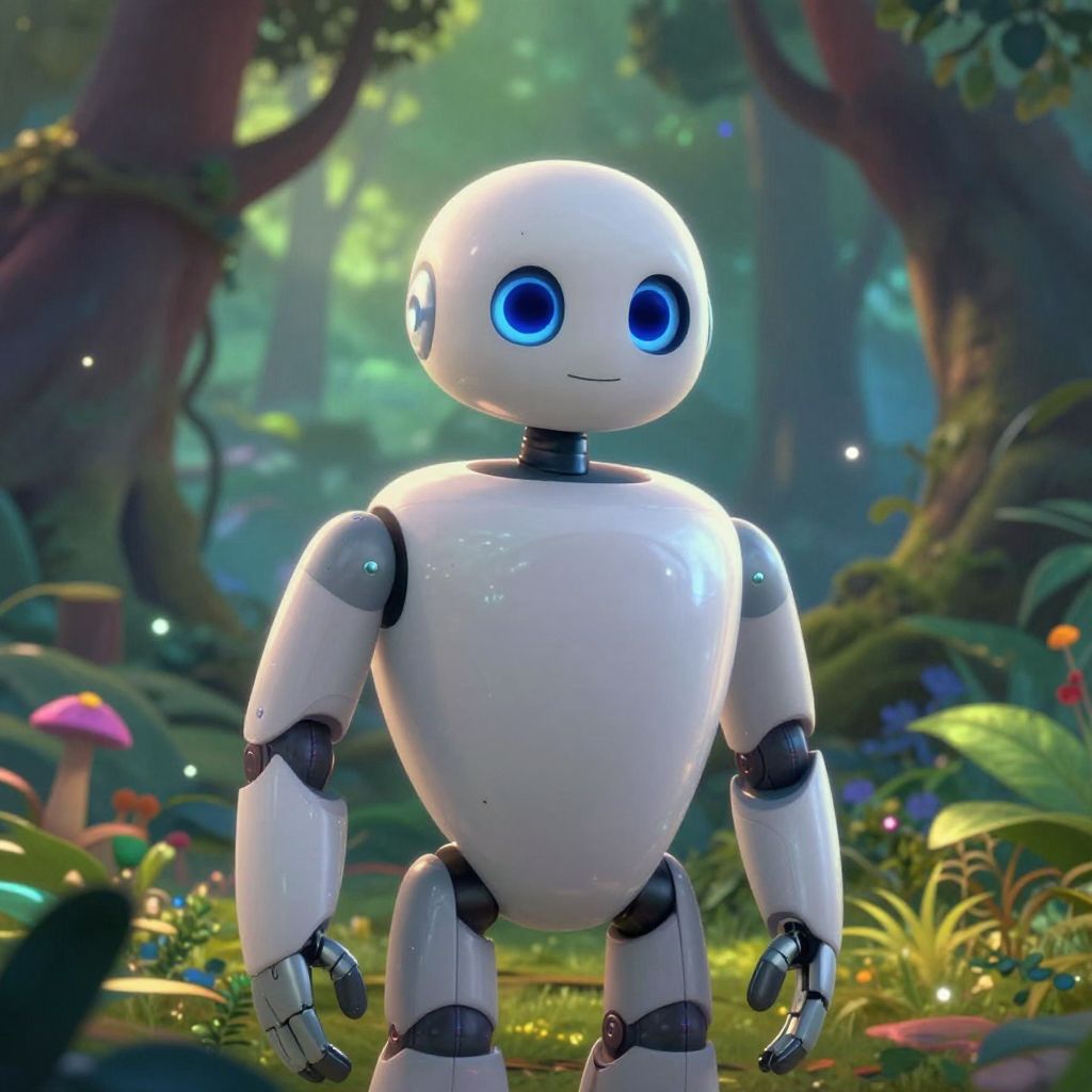 This digital CGI image depicts a vibrant forest scene with a young girl and a red, spherical robot with large, expressive eyes and metallic limbs. The girl, with short black hair, wears a white t-shirt and blue shorts, standing on a grassy path. The robot, shiny and red with a textured surface, stands on two legs with mechanical arms and legs, and a small antenna on its head. The background features towering trees, lush greenery, and colorful mushrooms. Soft sunlight filters through the forest canopy, creating a magical, whimsical atmosphere. The girl looks up at the robot with curiosity.