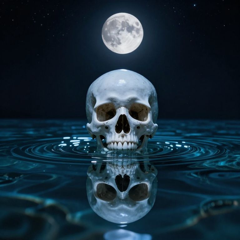 The image presents a surreal and haunting scene where a clear skull, with its intricate details and hollow eyes, floats in a glassy ocean landscape. The skull is reflected perfectly on the surface of the water, creating a symmetrical and eerie effect. Above the skull, a full moon with a similar skull-like shape hovers in the starry night sky, adding to the otherworldly atmosphere. The colors are predominantly cool tones, with shades of blue and black dominating the scene, enhancing the sense of depth and mystery. The composition is balanced, with the skull and moon positioned centrally, drawing the viewer's eye to the central focal point. The textures of the skull and the water's surface are crisp and detailed, creating a striking contrast between the hard, smooth bone and the fluid, reflective water. The overall effect is both visually striking and emotionally evocative, capturing a moment of cosmic stillness and introspection.