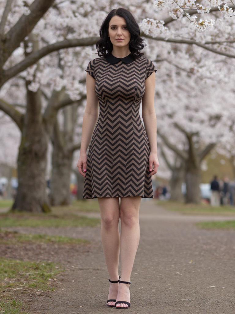 A slim woman in a knee-length A-line shift dress featuring a black and brown zigzag pattern and a black Peter Pan collar, paired with black heeled sandals, stands in a botanical garden under the cherry blossoms, captured in the visual style of Richard Estes. Sexy. Pretty face and beаutiful eyes. Big breasts
