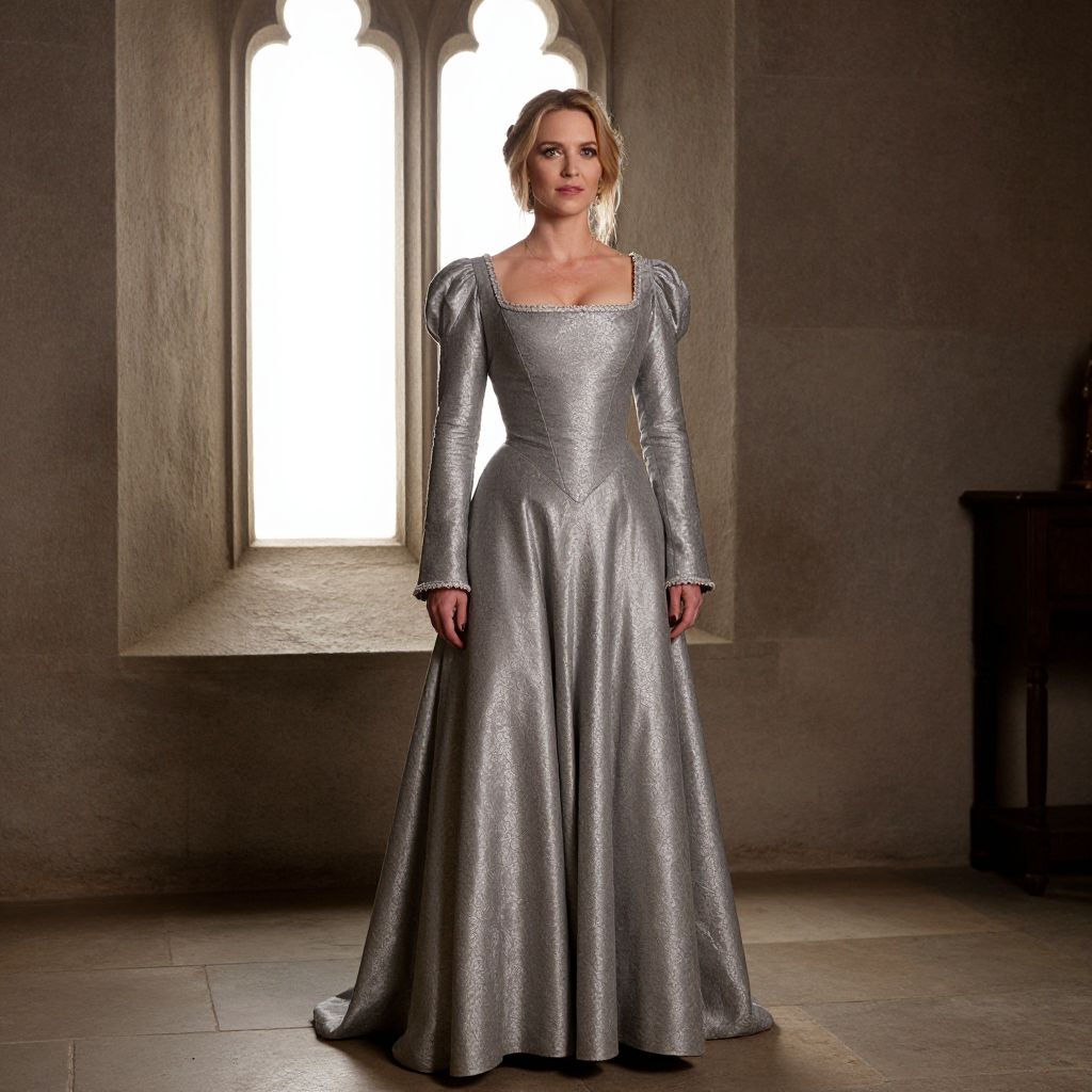 Photograph of a Caucasian woman with fair skin and blonde hair in an elegant, medieval-style silver gown with puffed sleeves and a square neckline. The gown is long and floor-length with a subtle shimmer. She stands in a dimly lit, stone-walled room with a large, arched window behind her, allowing bright light to stream in. Her expression is neutral, and her hands rest by her sides. The room has a medieval, castle-like ambiance with a dark wooden table partially visible on the right. The overall tone is serene and regal.
