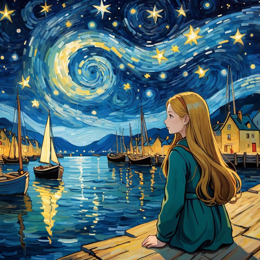 This digital illustration depicts a young woman with long, flowing blonde hair, wearing a green jacket, sitting on a wooden dock by a serene, starlit harbor. The night sky is vividly painted with swirling blues and whites, featuring a bright crescent moon and numerous yellow stars. Sailboats with illuminated sails are moored in the calm, reflective water. In the background, small, yellow-lit houses with red roofs line the shore, surrounded by gentle hills. The woman gazes contemplatively at the mesmerizing night sky, creating a peaceful yet magical atmosphere. The art style is reminiscent of Vincent van Gogh's swirling technique, blending vibrant colors with dynamic, fluid brushstrokes.