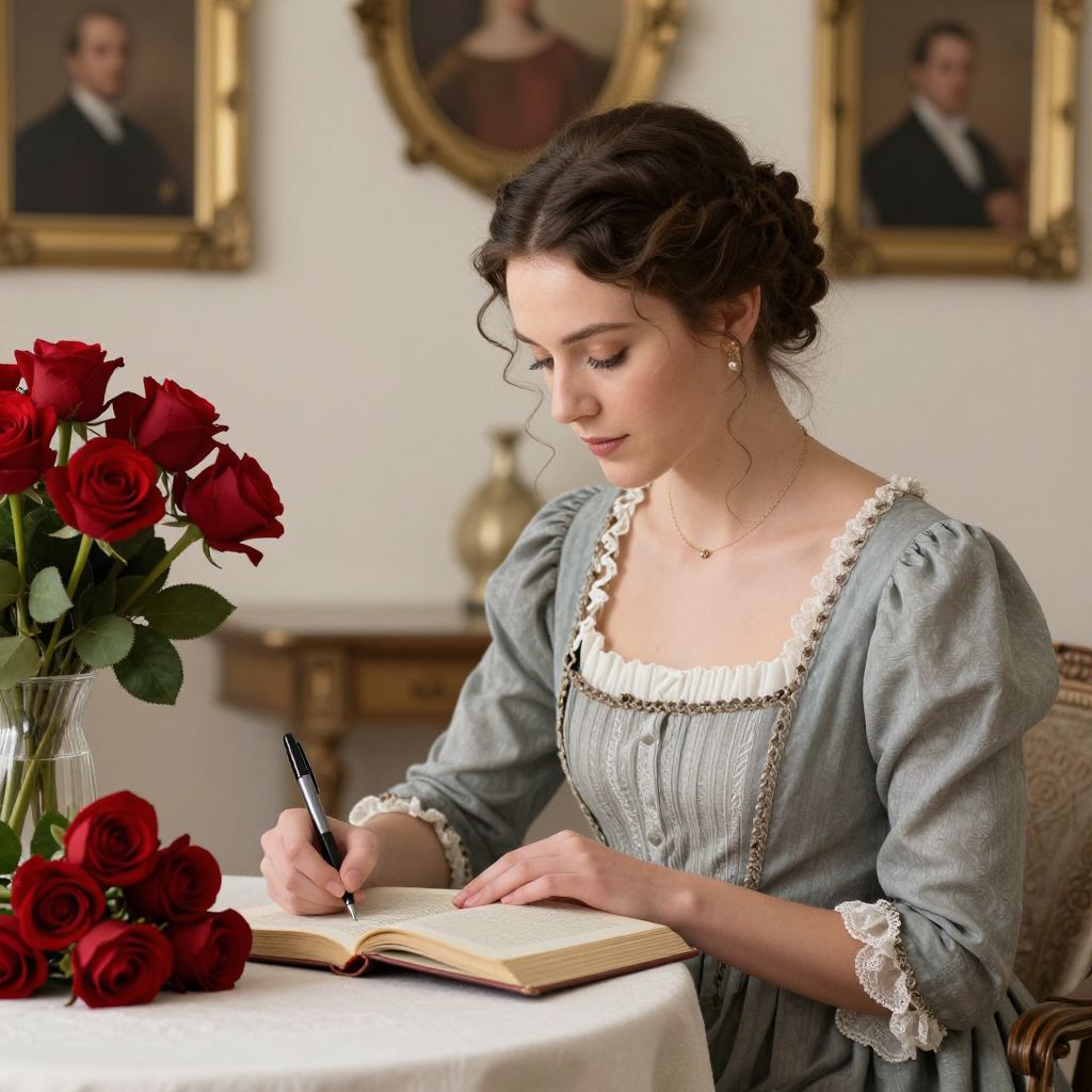 Elegant woman in period attire sits gracefully at a table, writing in an open book while surrounded by a bouquet of vibrant red roses and framed portraits in a softly lit room.