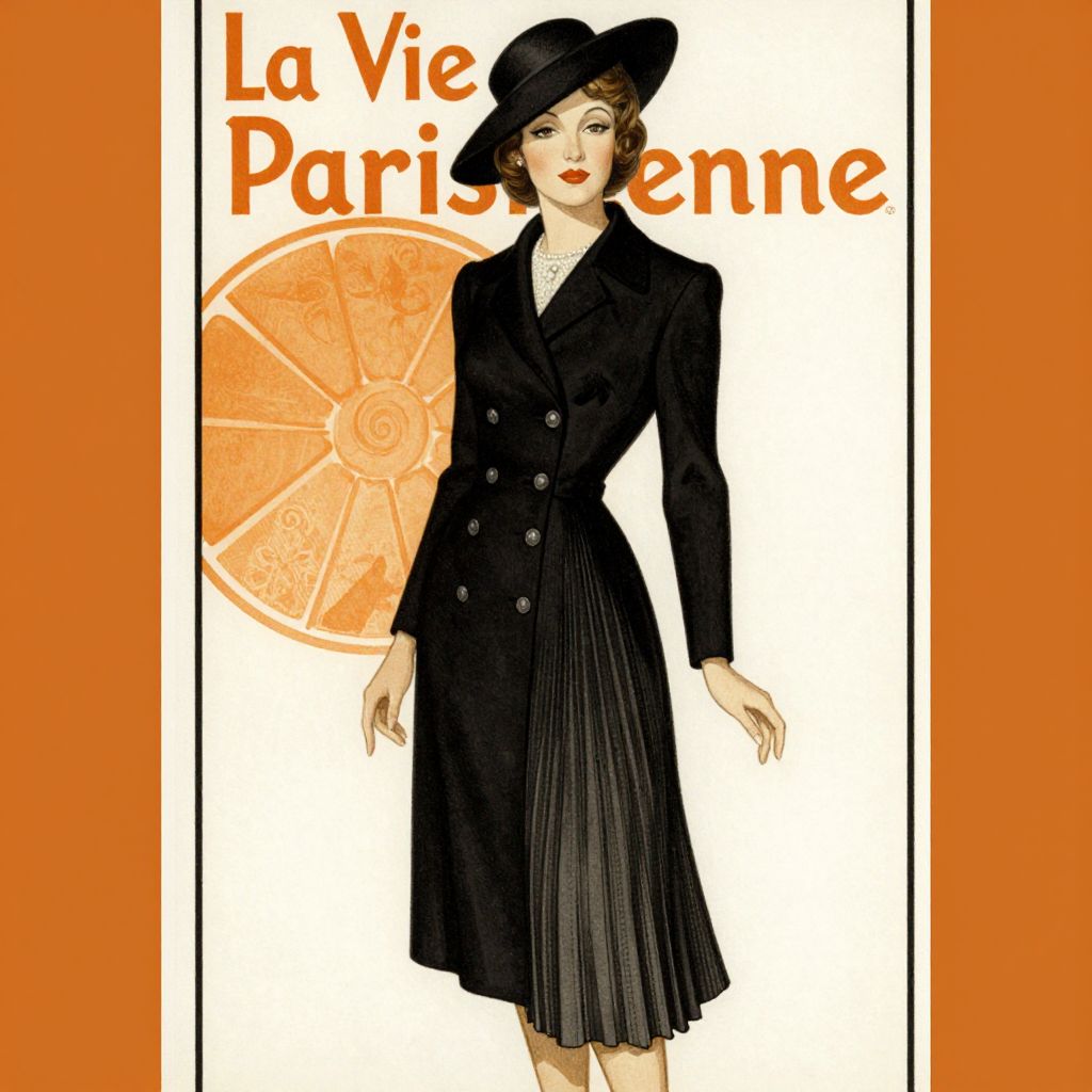 Elegant illustration of a woman in a chic 1938 Parisian ensemble, featuring a black coat, pleated skirt, and hat, set against a vintage advertisement backdrop for *La Vie Parisienne*, framed by bold orange borders and text.