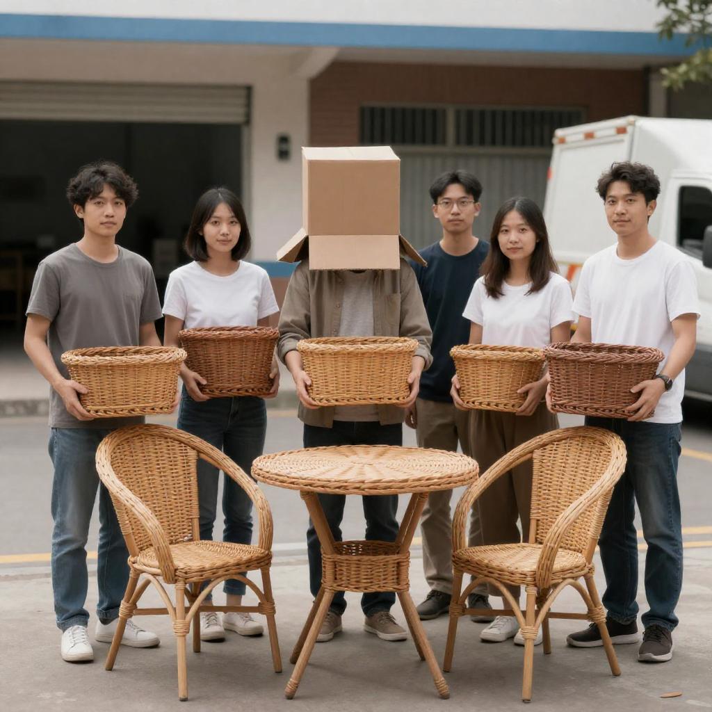 Group photo of six people standing outside holding wicker furniture. One person wears a cardboard box on their head. People have casual clothes. Furniture includes chairs and a table. Background shows building and truck. Paved sidewalk in foreground.