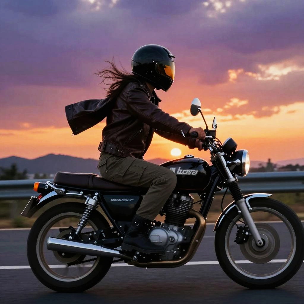 Leather jacket with cargo pants worn by a stylish biker on an open highway at sunset, wind blowing jacket open slightly, blurred motion effect, dramatic sky with orange and purple hues, dynamic action shot, vintage yet modern motorcycle culture aesthetic