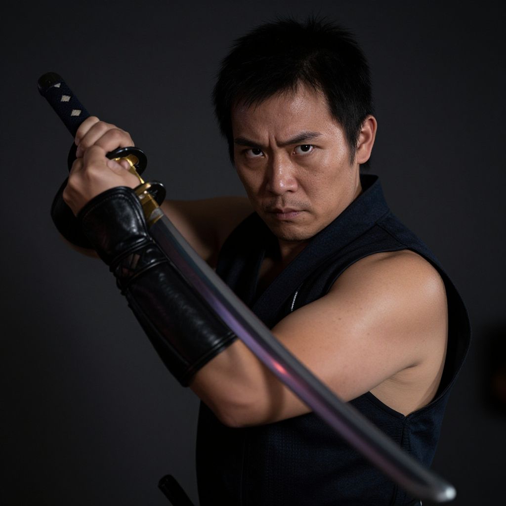 Photograph of a serious, muscular Asian man with short black hair, wearing a black sleeveless top, gripping a katana, against a dark background