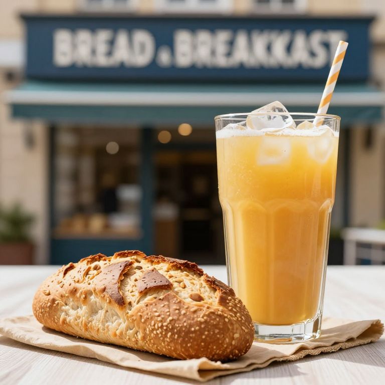 Photograph of a bright orange smoothie in a tall glass with a white-and-orange striped straw, placed on a white wooden surface with a brown napkin. In front of the glass is a crusty, sesame-seeded baguette. The background is a blurred storefront with a blue sign reading "BREAD BREAKFAST" in white letters. The smoothie's texture is slightly frothy, and the baguette has a golden-brown crust. Sunlight highlights the glass and baguette, creating a warm, inviting atmosphere.