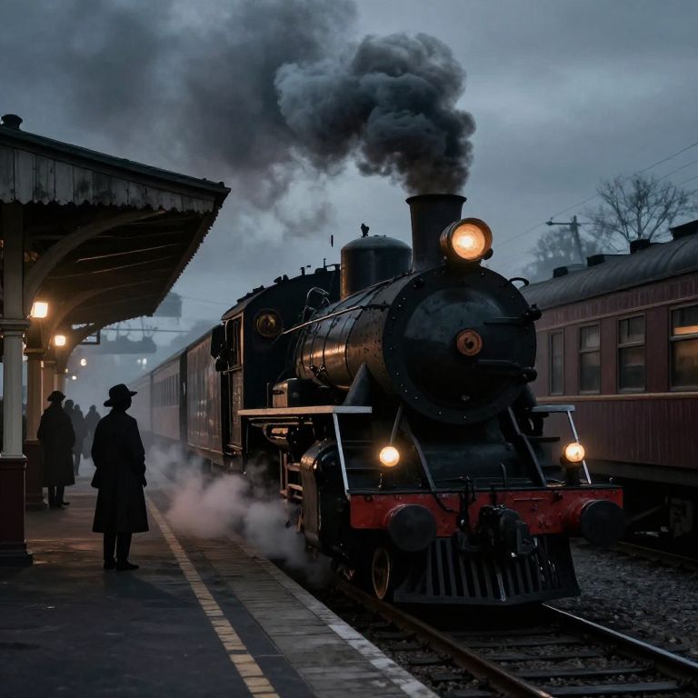 A moody, cinematic illustration depicts a vintage steam locomotive emitting a plume of smoke as it arrives at a dimly lit train station, where silhouetted figures stand on the platform, evoking a sense of nostalgia and mystery, blending retro aesthetics with dramatic lighting to capture the essence of departed souls boarding carriages driven by the ethereal power of regret.