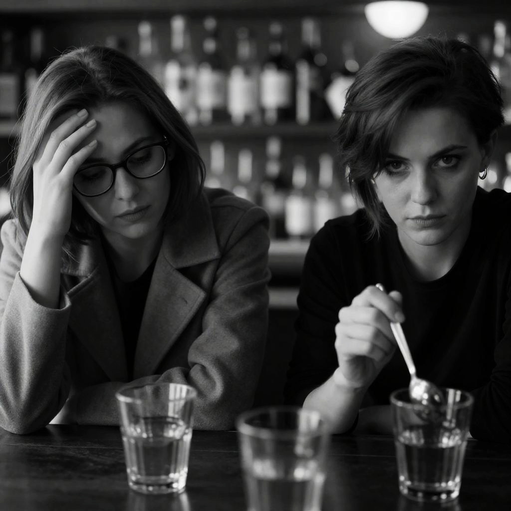 Black-and-white photograph of two women. Woman on left with long light hair, closed eyes, denim jacket, holding drink with straw. Woman on right with dark hair, eating sandwich, dark fur coat, focused expression. Background with blurred cones. Both walking.
