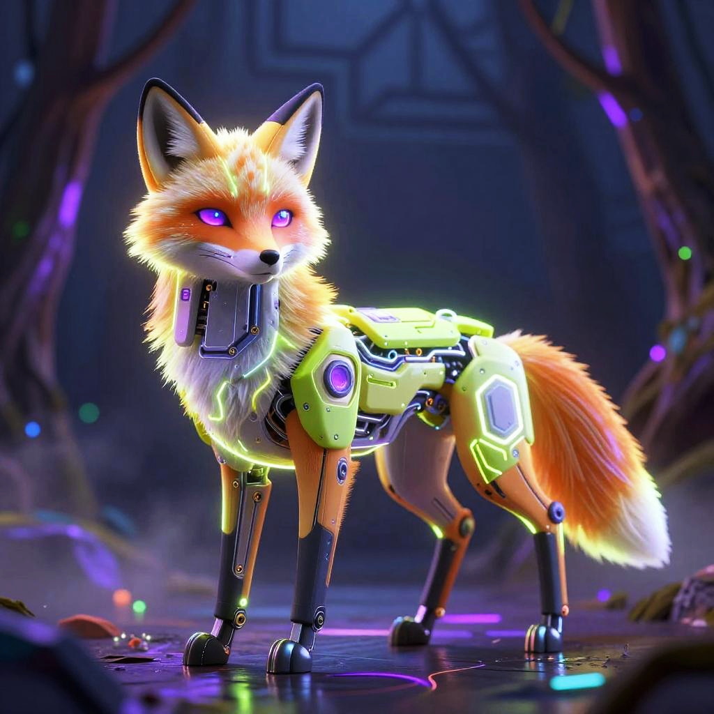Digital art of a glowing, cybernetic fox with orange fur, purple eyes, and neon accents in a dark, futuristic forest.