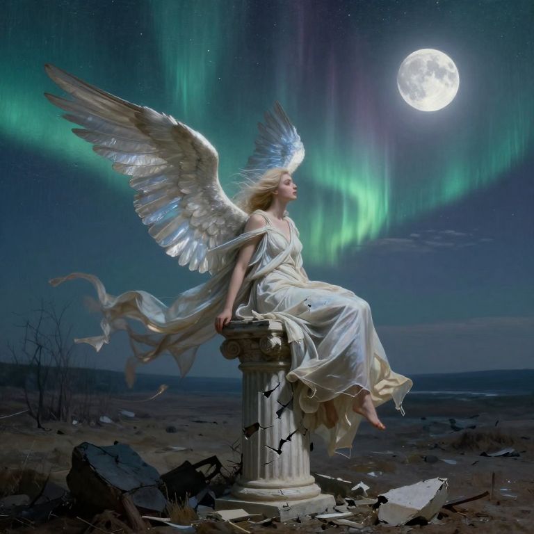 Angel with silver wings and flowing white dress sits on broken column under moonlit aurora, starry night sky. Digital artwork.