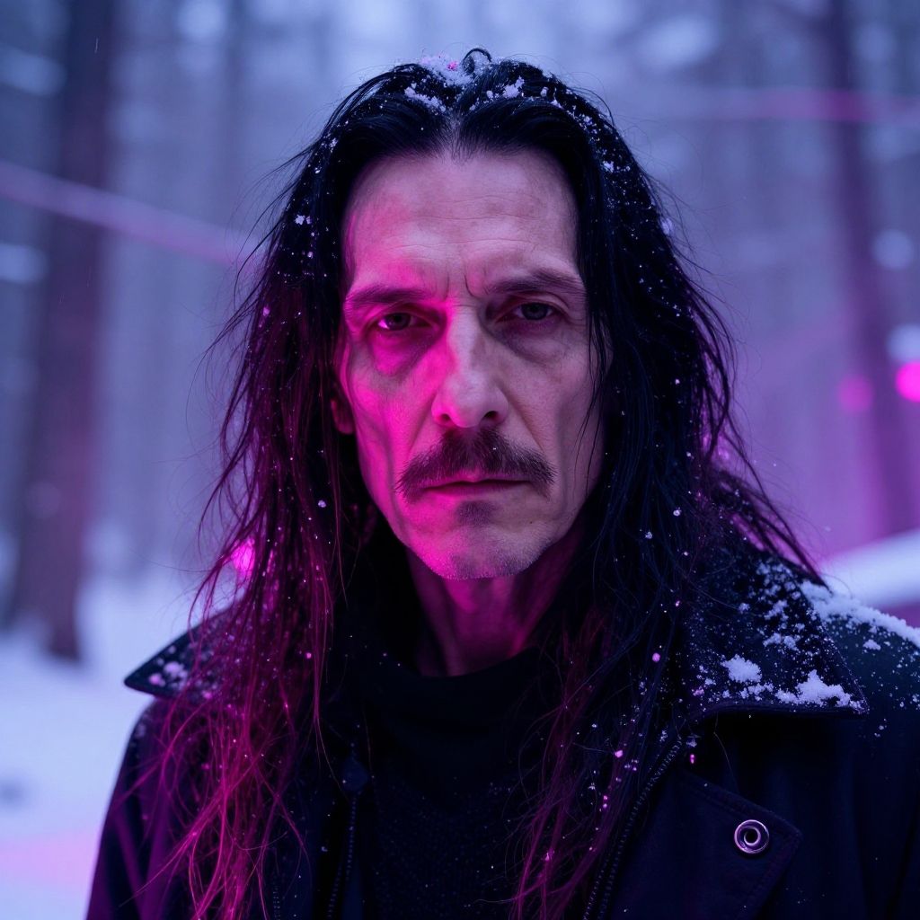 Photograph of a middle-aged man with long, wet, dark brown hair and a thin mustache, standing in a snowy forest. His face is illuminated by pink and purple neon light, creating a stark contrast against the blue and white wintry background. He is wearing a black coat, with snowflakes visible on his hair and shoulders. The man's expression is serious and intense, with deep-set eyes looking directly at the camera. The blurred, snow-covered trees in the background add to the cold, eerie atmosphere of the scene.
