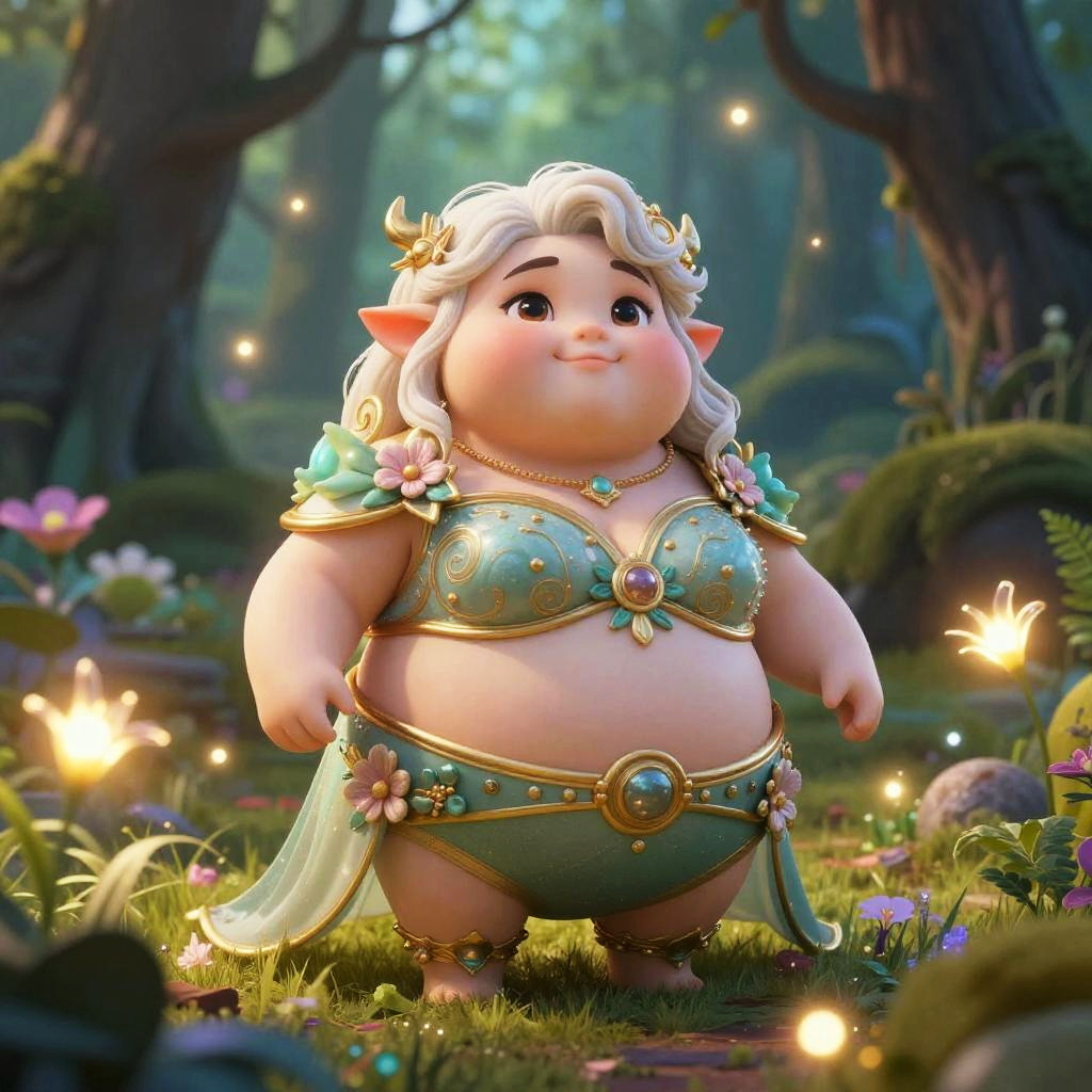 Mini curvaceous character in a fantasy forest, ethereal glowing flora surrounding, whimsical atmosphere, intricate costume details with floral patterns, magical light effects