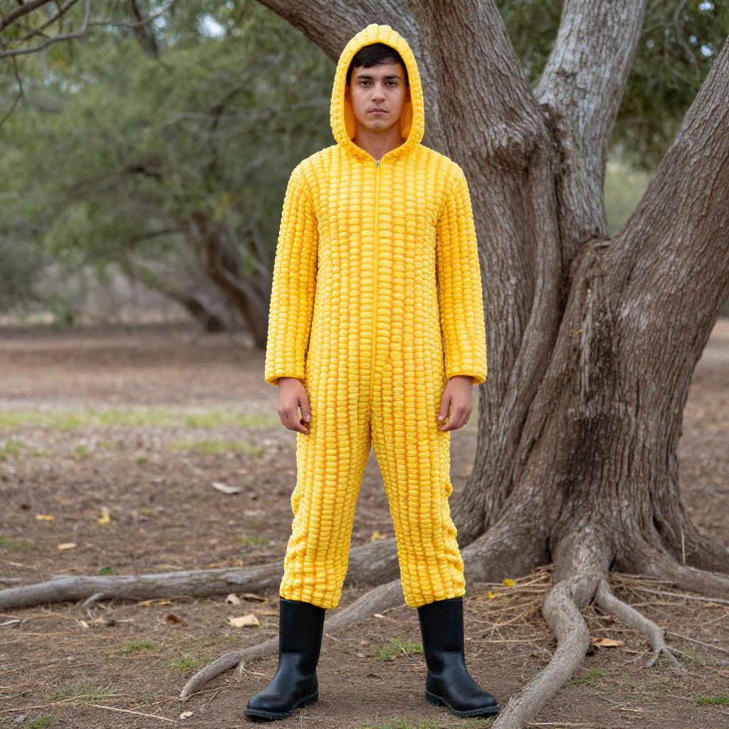 Corn cob jumper costume, solo, 1boy, male focus, boots, outdoors, standing, black footwear, full body, tree, looking at viewer, hood