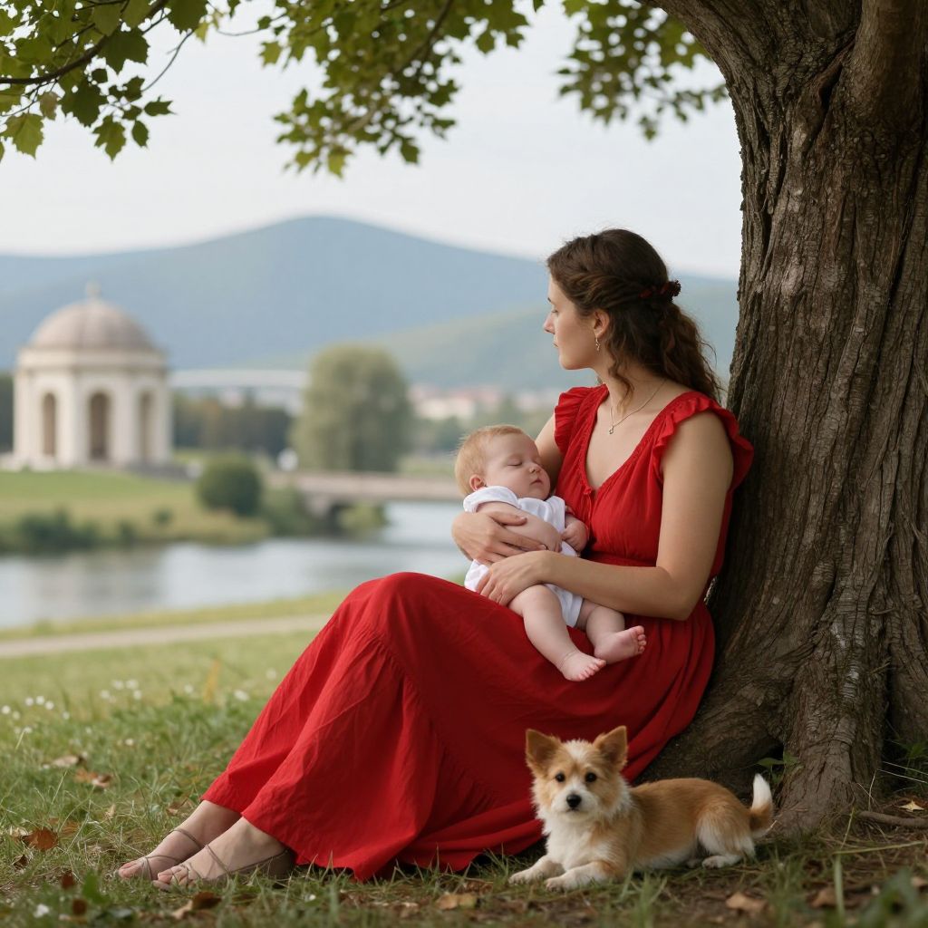 Seated under a tree, a woman in a flowing red dress cradles a sleeping infant in her arms, her gaze directed toward a serene landscape featuring distant mountains, a river, and a classical architectural structure, while a small dog rests near her feet.