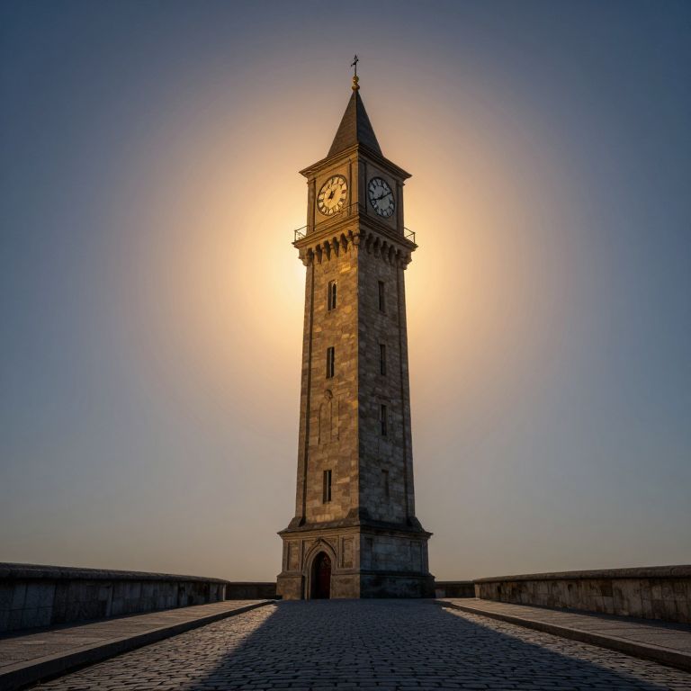 Majestic stone clock tower stands solemnly against a twilight sky, its four faces illuminated by the golden glow of a sun spiraling outward in concentric rings, casting an ethereal aura over the cobblestone path leading to its base.