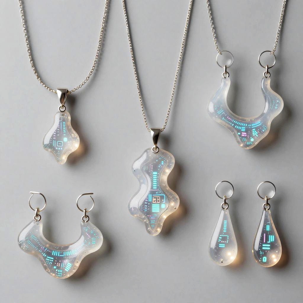 A collection of AI jewelry design pieces featuring delicate necklaces and earrings with organic, flowing shapes made of translucent materials and embedded digital patterns, illuminated by soft neon lights, emphasizing innovation and artistry.