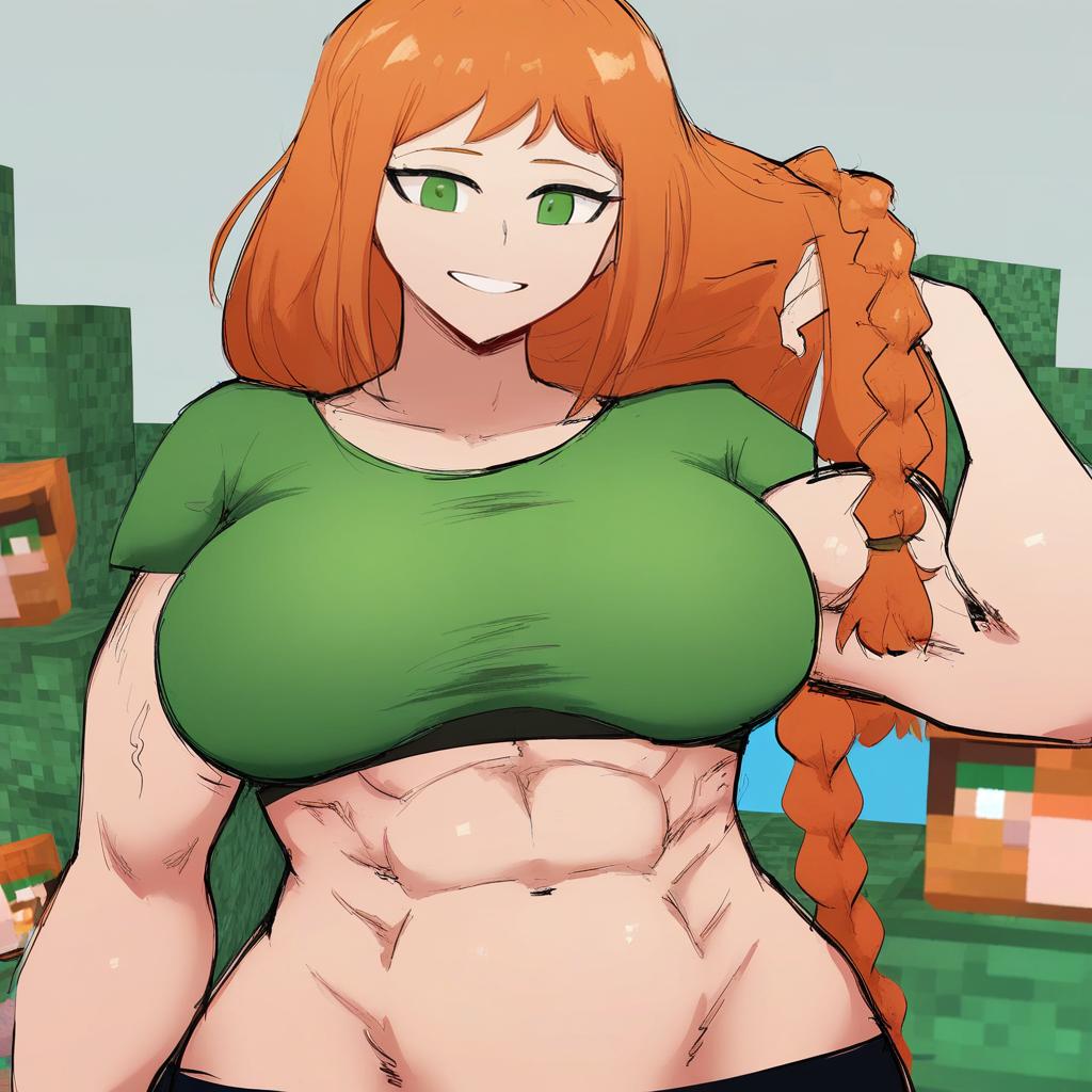 Alex (minecraft), minecraft, 1girl, green eyes, long hair, orange hair, braid, large breasts, green shirt, abs, muscular female, by artist valtor, leet