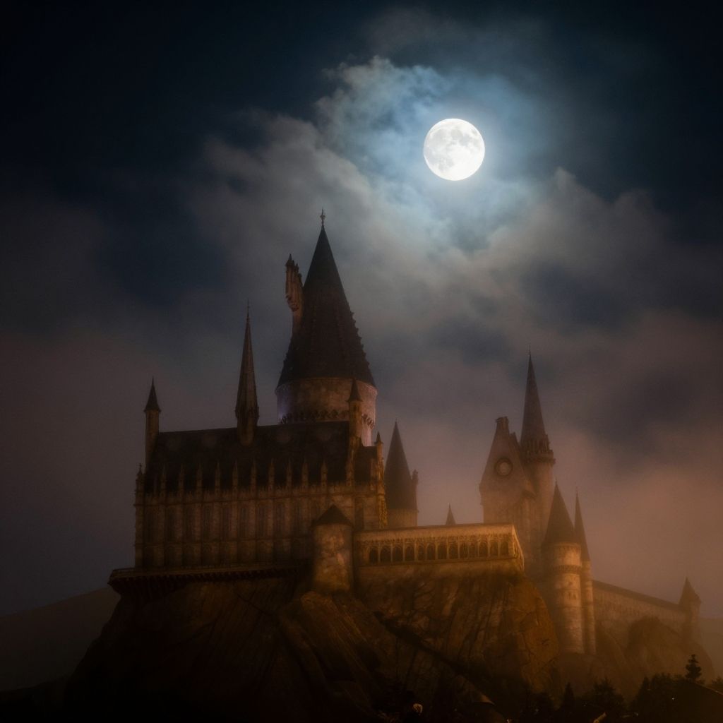 Photograph of Hogwarts Castle under a bright full moon, with dark, misty clouds surrounding the Gothic-style architecture. The moonlight illuminates the castle