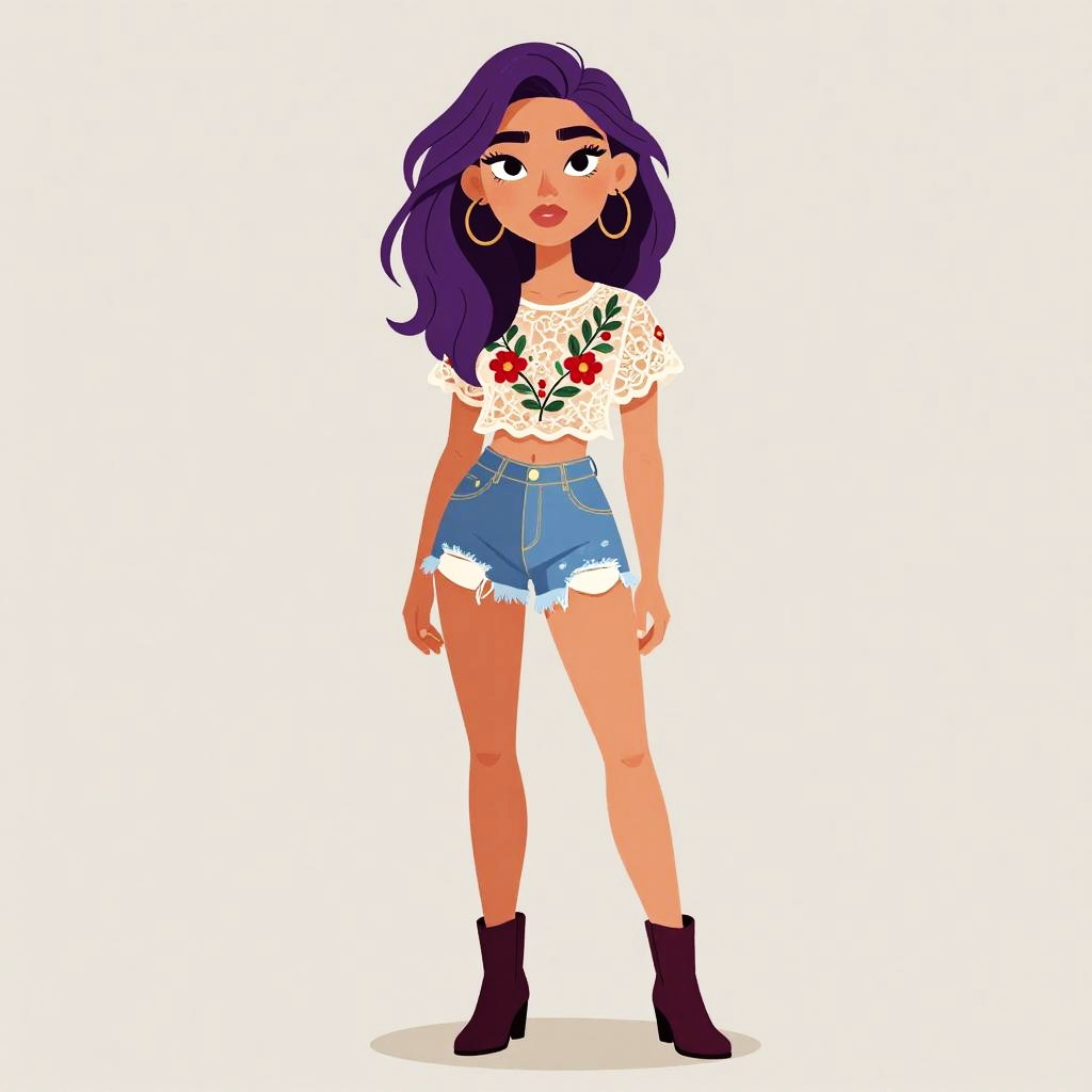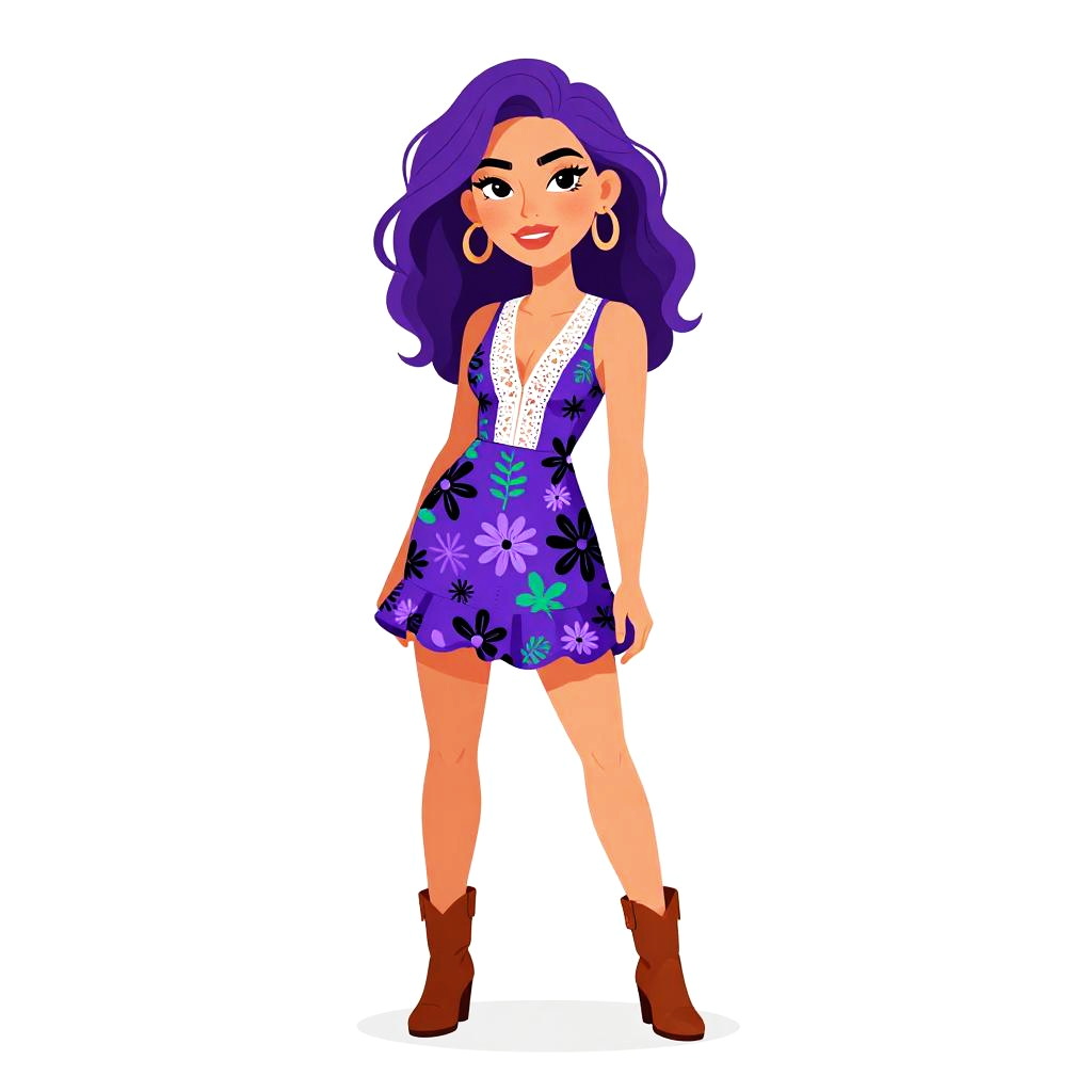 Woman with pretty face and pretty hair. Woman, bohemian style, sleeveless smock dress in vibrant orange with a tie-dye effect and scattered embellishments, square neckline, above-the-knee length, worn with slouchy suede knee-high boots, tousled wavy hair, natural setting with twilight and mountains in the background. --sref 1467