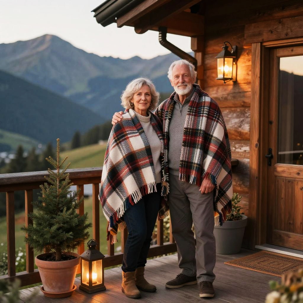A elderly couple confidently posing in a mountain cabin balcony at golden hour, adorned with rustic plaid blankets, wooden lanterns, potted evergreens and soft lighting, creating a captivating atmosphere.
