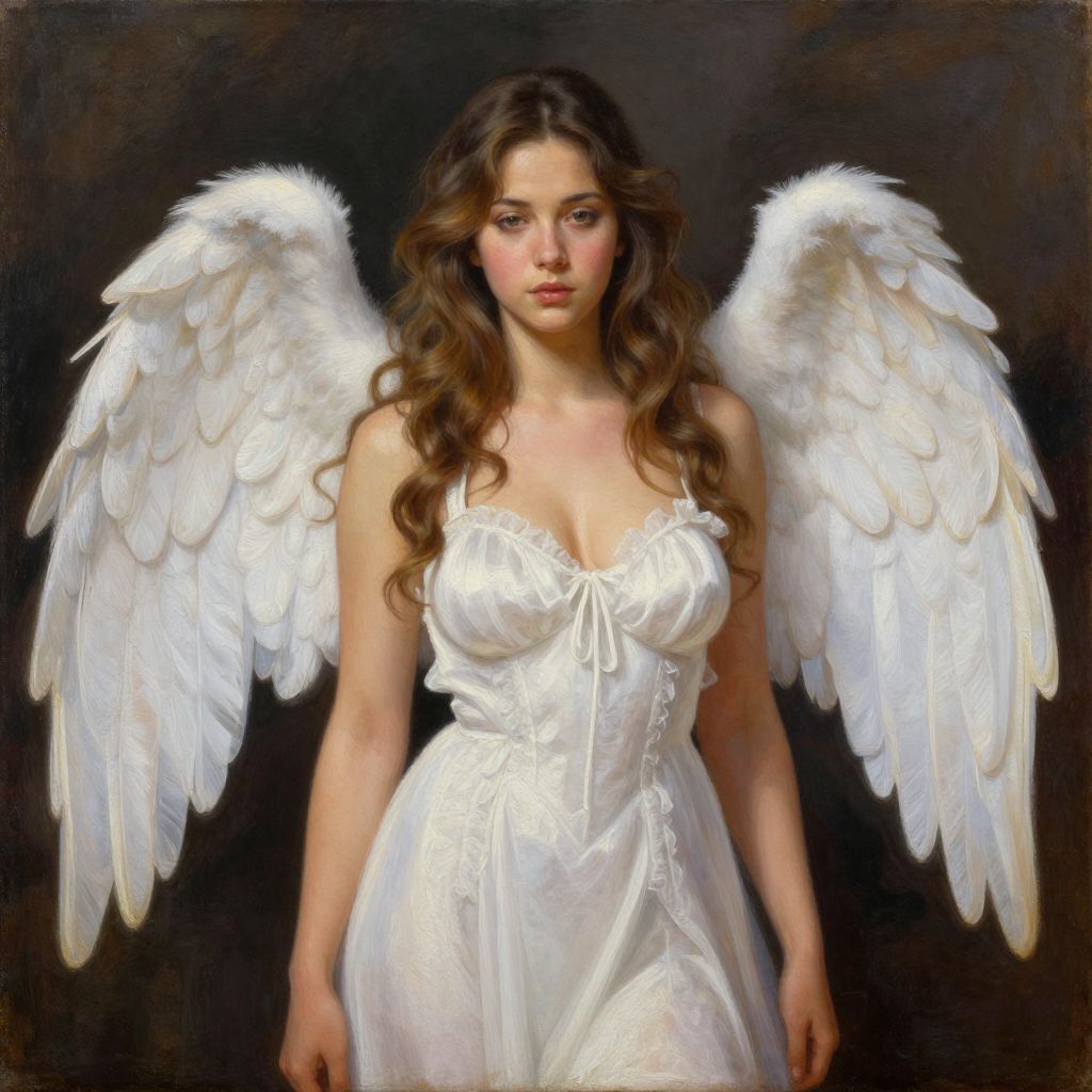 The image depicts a beautifully rendered oil painting portrait of a curvaceous anime woman, dressed as an angel. She is adorned in a white dress with delicate, ruffled details, complementing her angelic appearance. Her long, wavy hair cascades down her shoulders, adding to her ethereal look. The woman's wings, painted with intricate feather details, extend gracefully from her back, enhancing the angelic theme. Her expression is serene and contemplative, with a soft gaze that draws the viewer's attention. The background is a blend of dark and muted colors, which contrasts with the woman's white dress and wings, making her the focal point of the painting. The overall composition is balanced, with the woman's body centrally positioned, and the wings framing her face, creating a harmonious and visually appealing image.