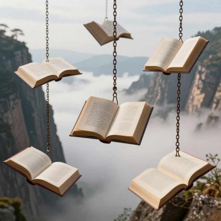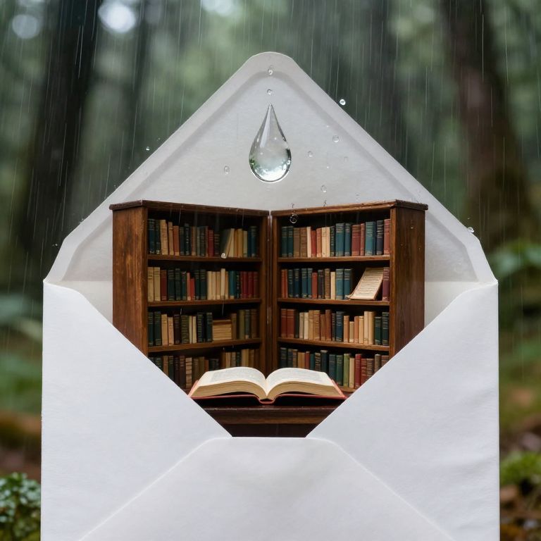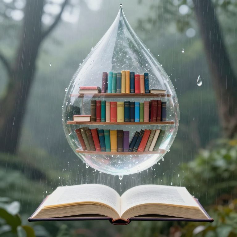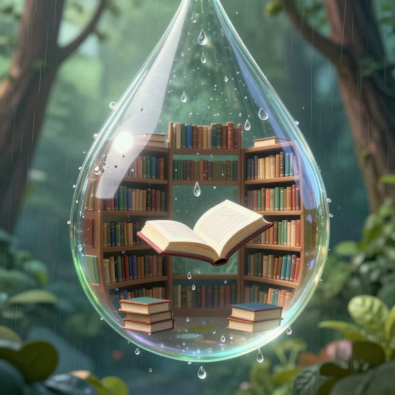 Translucent shelves brimming with colorful books float serenely within a giant, shimmering raindrop, while an open book rests below, its pages seemingly transformed into gentle raindrops cascading outward against a misty forest backdrop.