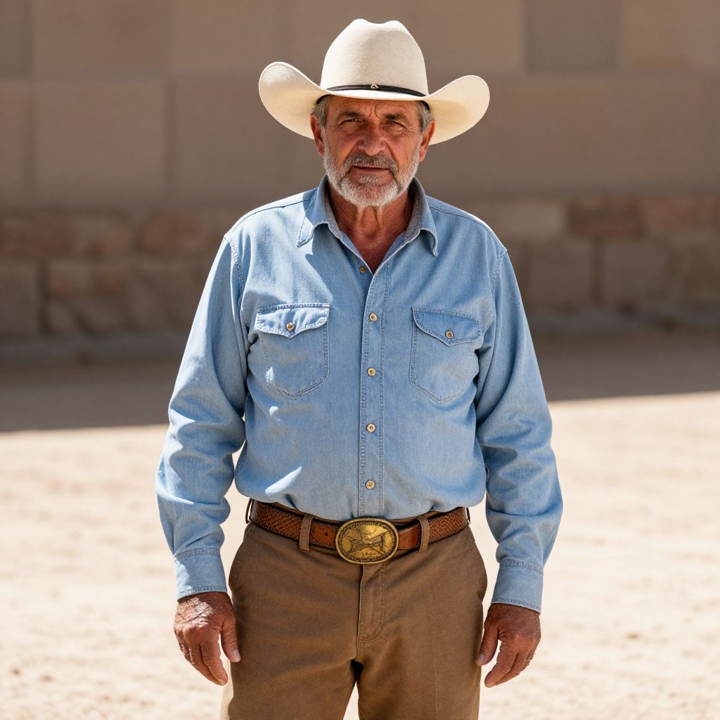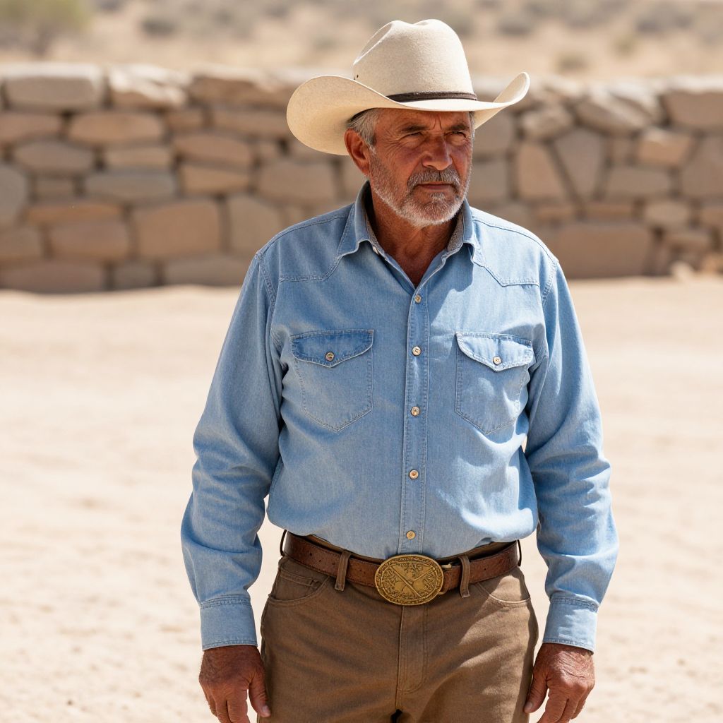 Photograph of an older man with a graying beard and mustache, wearing a light blue button-up shirt, brown pants, and a beige cowboy hat. He's standing in a sunlit, sandy area with a stone wall in the background. His shirt has pockets and he's wearing a brown belt with a brass buckle. The overall vibe is rugged and Western.