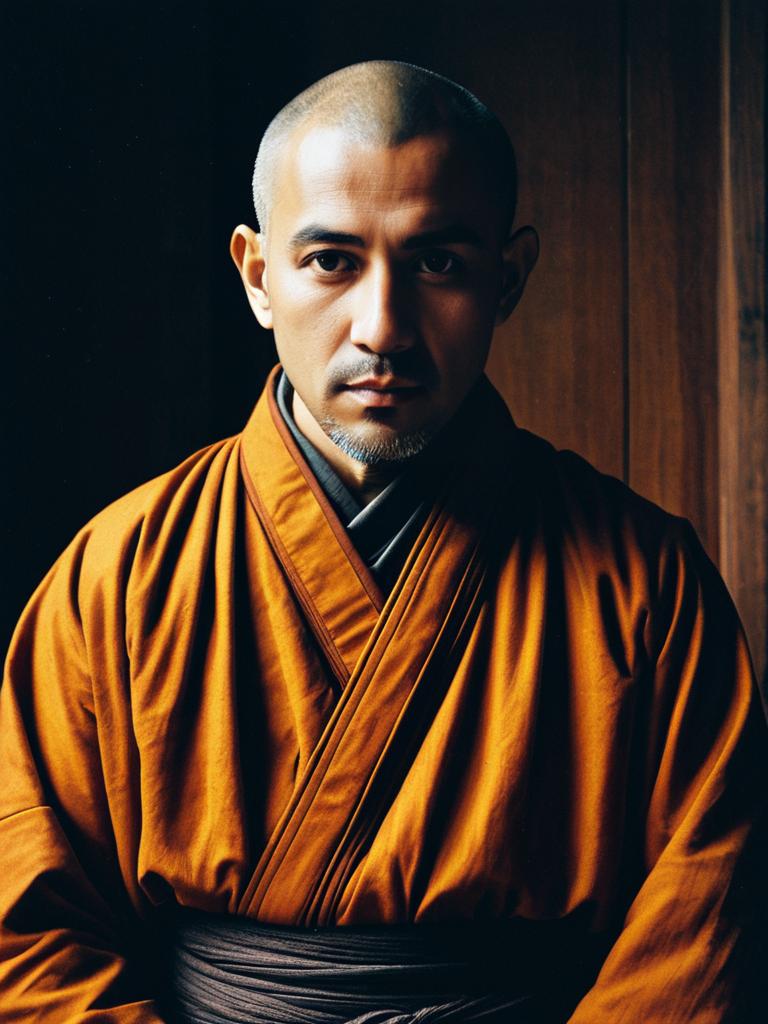 Waist-up editorial portrait of an Asian man wearing a traditional orange monk robe. The subject has a shaved head and a short beard, with a serious expression. The image features photorealistic tones and soft lighting against a neutral background.