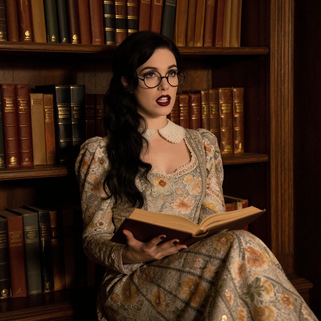 In a dimly-lit, antiquated study nestled within the heart of a sprawling, ivy-covered Victorian manor, a striking woman named M3RPHYNR poses with an open book in her hands, Her raven-black hair cascades like ink down her back, and she wears round, retro glasses that frame her piercing eyes, Her teeth flash white against the deep crimson of her full lips, which are slightly parted as if in deep thought, The study's warm, golden light casts dramatic shadows across her angular features, illuminating the intricate details of her delicate skin and the subtle lines around her eyes that hint at a life well-lived, A bookshelf filled with leather-bound tomes and antique trinkets looms behind her, its worn wooden surface adding an air of sophistication and knowledge to the scene, The woman's outfit - a floor-length, vintage dress adorned with intricate lace details and a Peter Pan collar - complements the study's old-world charm while also conveying a sense of timeless elegance, Her pose is relaxed yet poised, her body slightly tilted as she leans against the bookshelf, one leg crossed over the other, her book held loosely in her lap, creating an intimate and inviting atmosphere for the viewer, The overall effect is one of intellectual intrigue, with M3RPHYNR appearing both mysterious and alluring as she lost in the pages of her book, surrounded by the rich tapestry of knowledge that the study offers