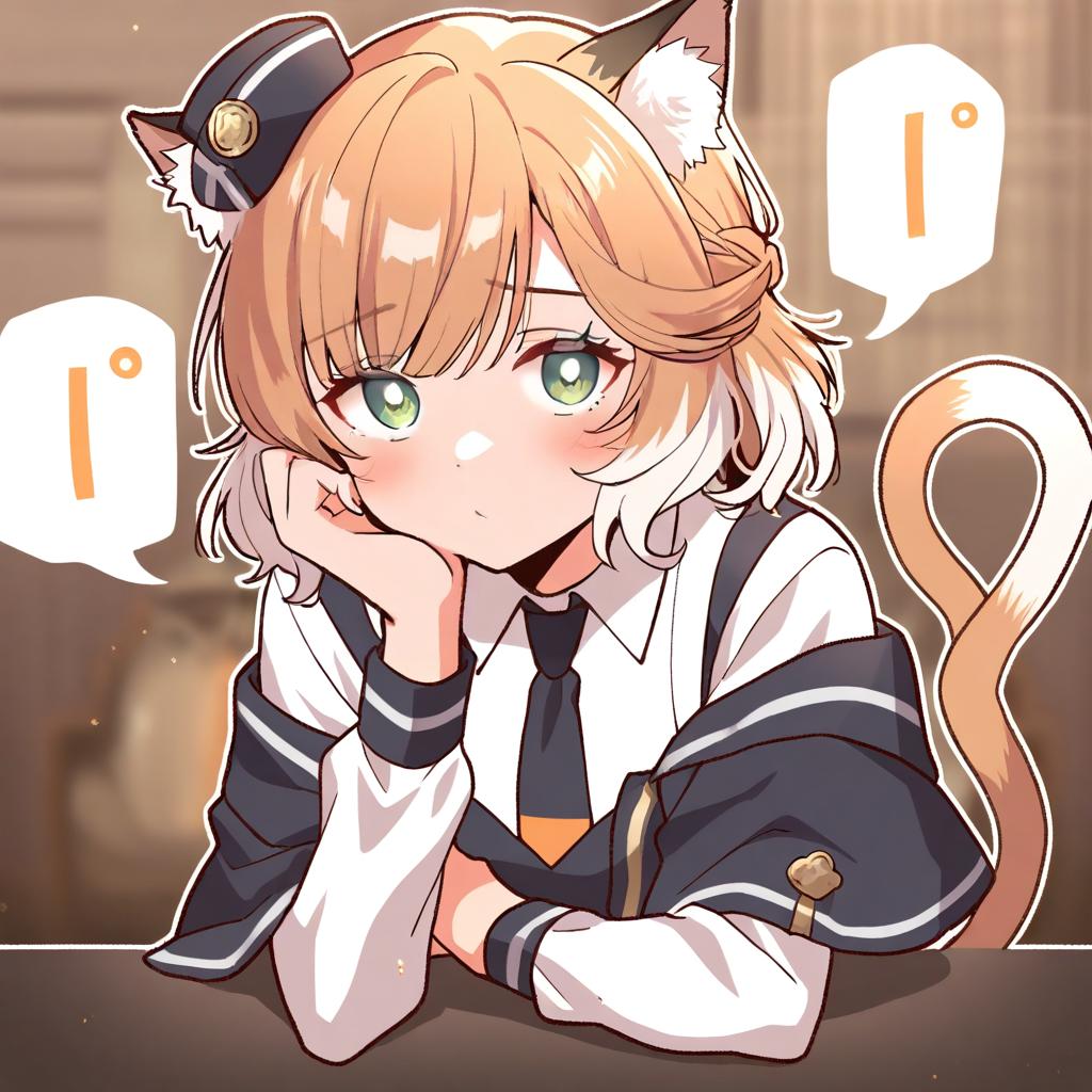 Mousse (arknights), arknights, 1girl, cat girl, cat ears, cat tail, animal ear fluff, two tails, green eyes, white hair, short hair, blonde hair, orange hair, two-tone hair, brown hair, multicolored hair, white shirt, black headwear, mini hat, collared shirt, long sleeves, black necktie, by artist shintarou, anime