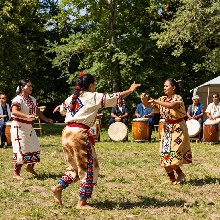 Dynamic scene of dancers wearing traditional Iroquois clothing with bright geometric designs and natural dyes, performing in a sunlit clearing amid tall trees and handmade drums.
