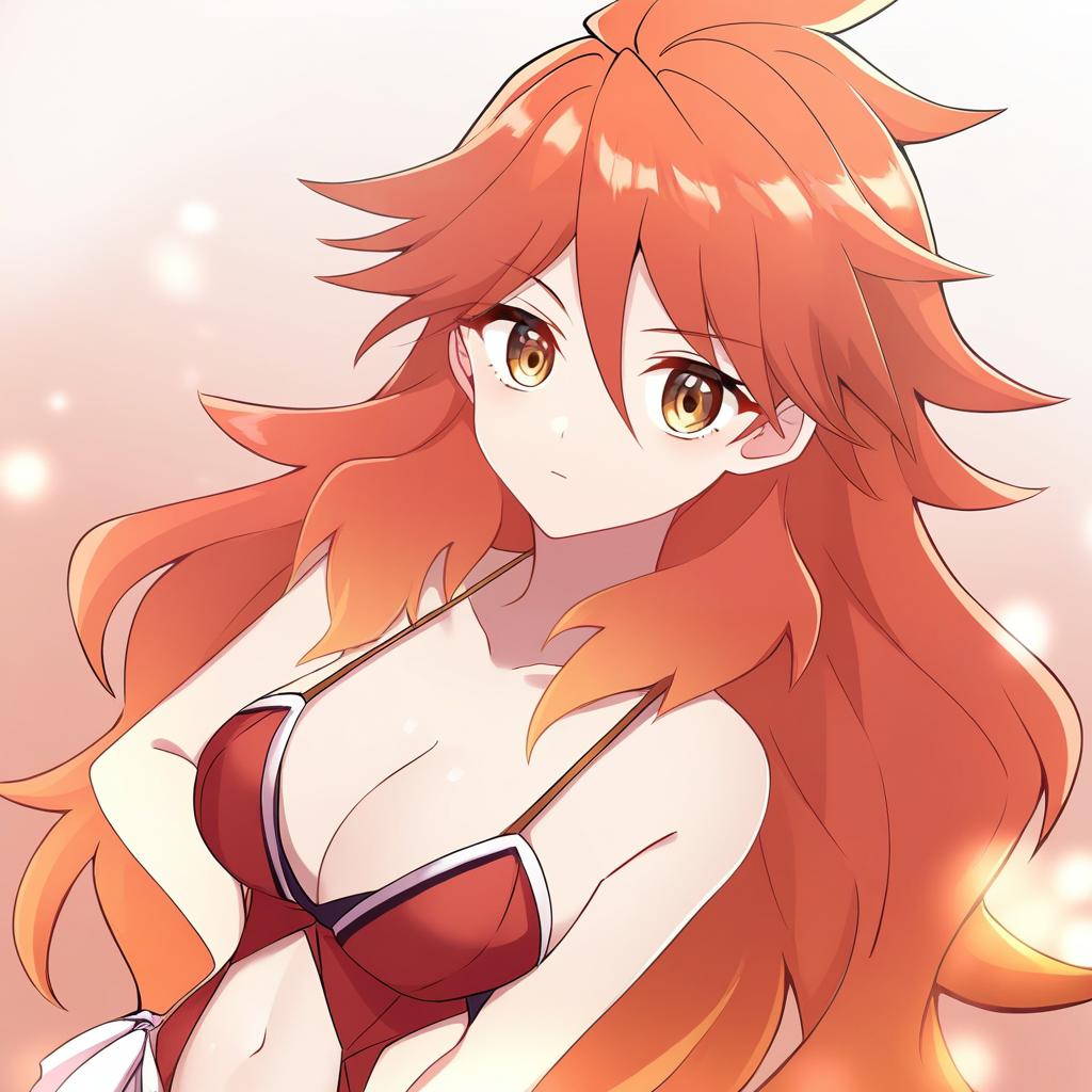 Amou kanade, senki zesshou symphogear, 1girl, red eyes, hair between eyes, orange eyes, red hair, long hair, large breasts, cleavage, navel, by artist yukichi (eikichi), leet