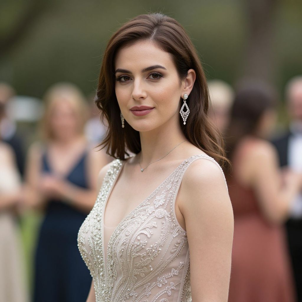 Wedding guest outfit woman, 1girl, solo, brown hair, jewelry, earrings, dress, blurry, blurry background, looking at viewer, outdoors