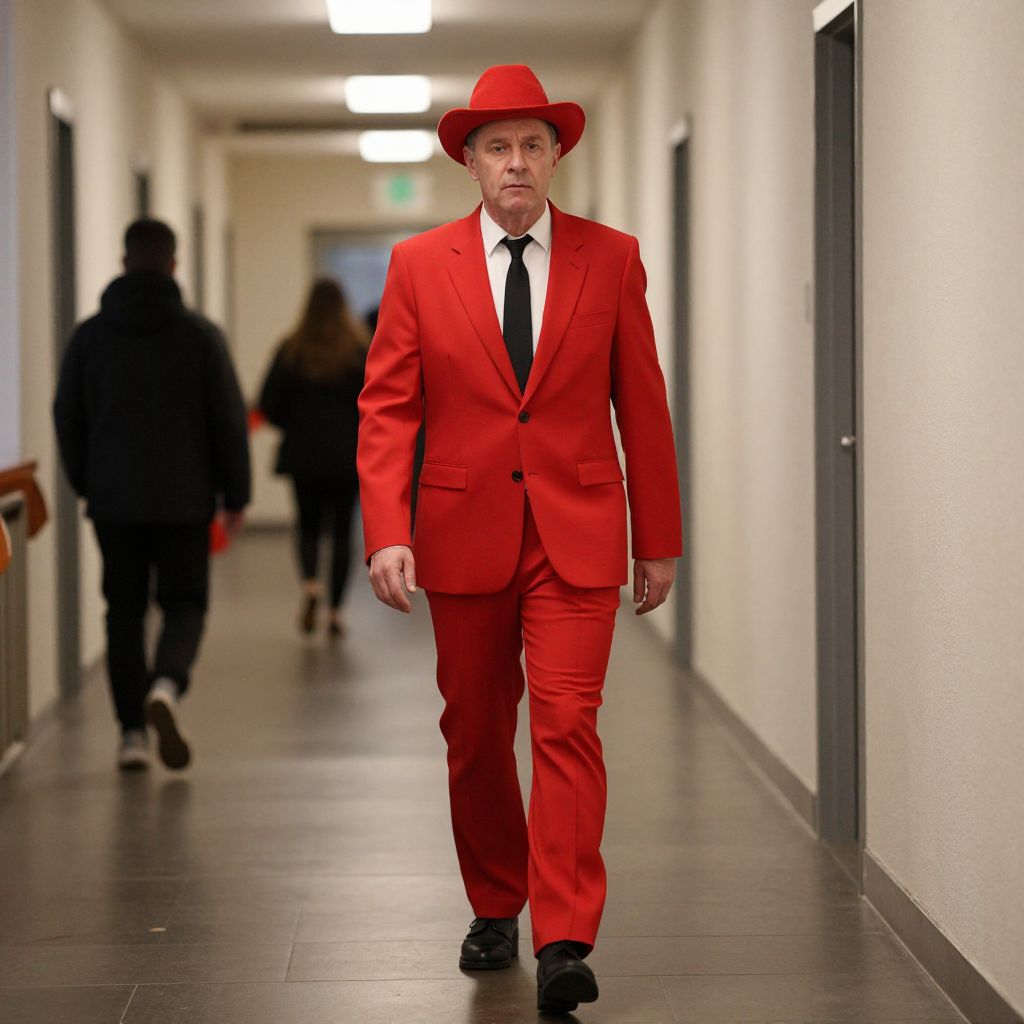 Photograph of a middle-aged man walking down a brightly lit, narrow hallway with white walls and dark gray tiles. He wears a striking, vibrant red suit with a black tie and white shirt, complemented by a red fedora hat. His expression is neutral, and he has short, light-colored hair. In the blurred background, two people in dark clothing walk away from the camera. Fluorescent lights hang from the ceiling, casting a bright, even light. The hallway has closed doors on either side, with one door slightly ajar on the right. The overall style is modern and somewhat surreal.