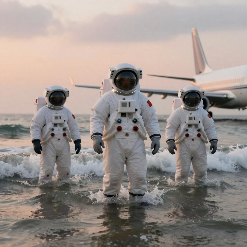 Three astronauts in full space suits with glowing helmets stand under a swing set at night. Bright lights shine from the left and center, casting long shadows. Dark, misty background. Swing set on the right.