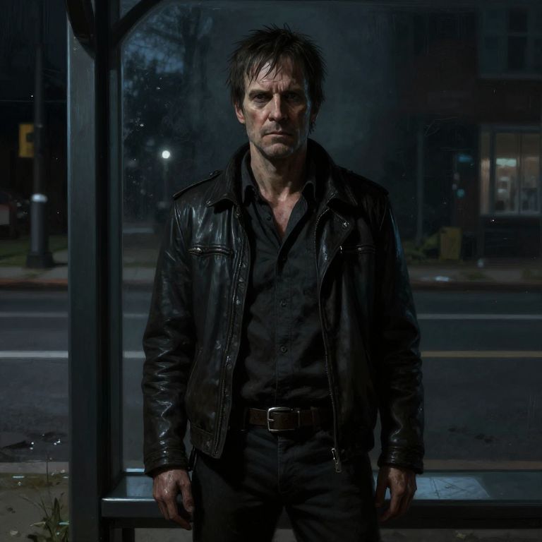 Photorealistic digital artwork of a middle-aged man with dark hair, wearing a black cardigan over a white shirt, standing in front of a two