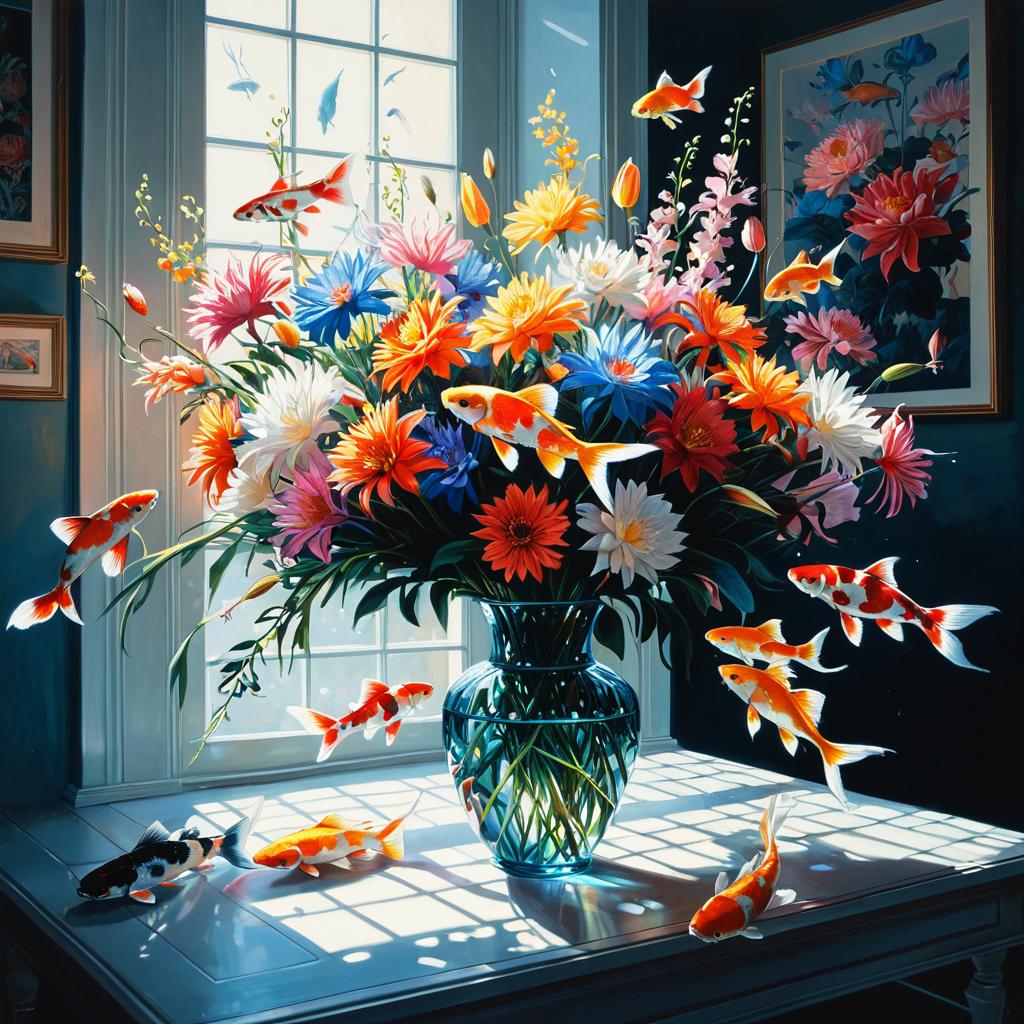 A vivid and detailed painting depicting a large bouquet of colorful flowers with long petals arranged in a clear glass vase. The bouquet features orange, blue, white, pink, and yellow flowers, illuminated by strong afternoon sunlight casting hard light and long shadows on the table. Surrounding the bouquet are vibrant koi fish appearing to fly around, adding a surreal and glowing neon effect. The scene is set indoors near a large window with framed floral artwork on the dark walls, contributing to the masterful composition.