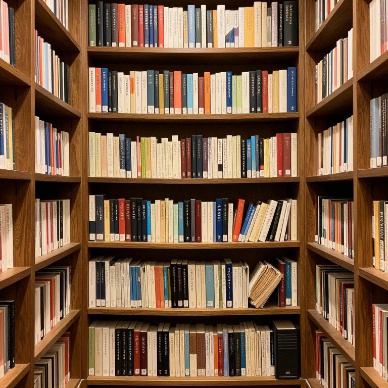 A library interior featuring wooden bookshelves packed with numerous books that have indistinguishable, unreadable spines. The books are arranged neatly in rows, creating an immersive and mysterious atmosphere. The unique aspect is the concept that these books warp reality into alternate plots the moment you glance away.