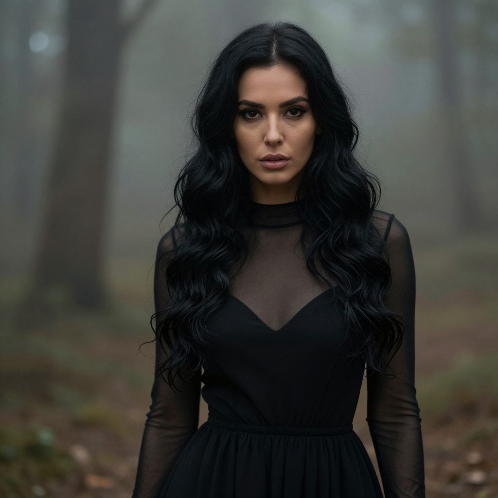 Photograph of a beautiful woman with long, wavy black hair and dark eyes, standing in a misty forest. She's wearing a black, sheer, long-sleeved dress with a high neckline. The background is blurry with trees and fog. Her expression is serious and slightly mysterious. The lighting is soft, giving her a slightly ethereal look. The overall vibe is dark and enchanting.