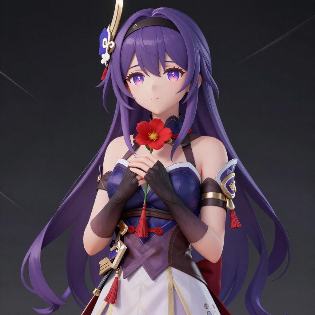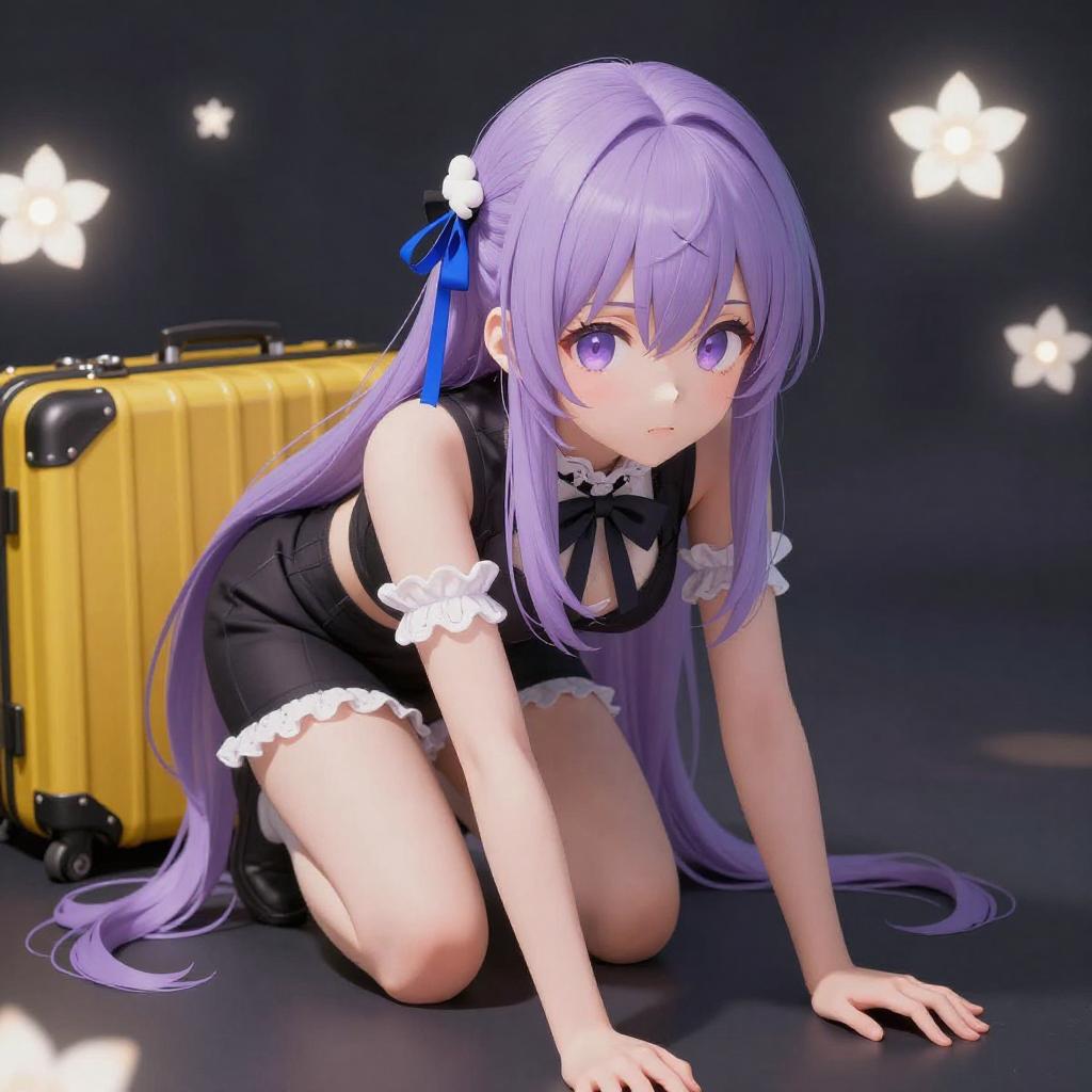 Digital artwork of an anime-style girl with long, lavender hair and blue ribbons, crawling on all fours. She wears a black, sleeveless top with white lace cuffs and a black bow. Her pale skin contrasts with the dark background, which features glowing white flowers. A yellow suitcase is on the left. Her expression is focused, and her hands are spread on the ground.