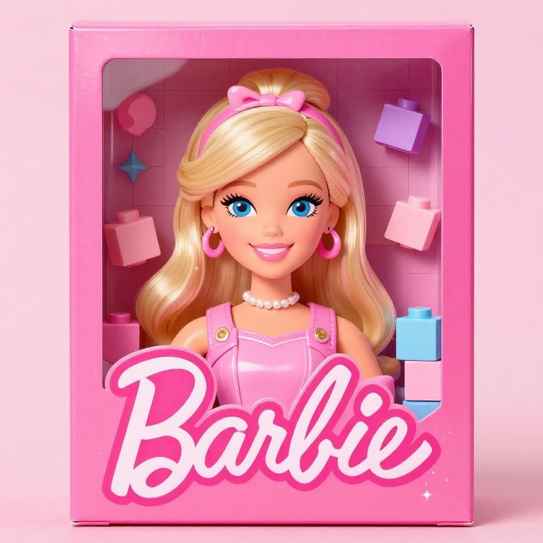 Barbie box filter style portrait of a smiling figure surrounded by toy blocks and pastel decorations, with a smooth pink overlay, shiny surfaces and subtle glitter accents, rendered in a vibrant, cheerful fashion illustration style